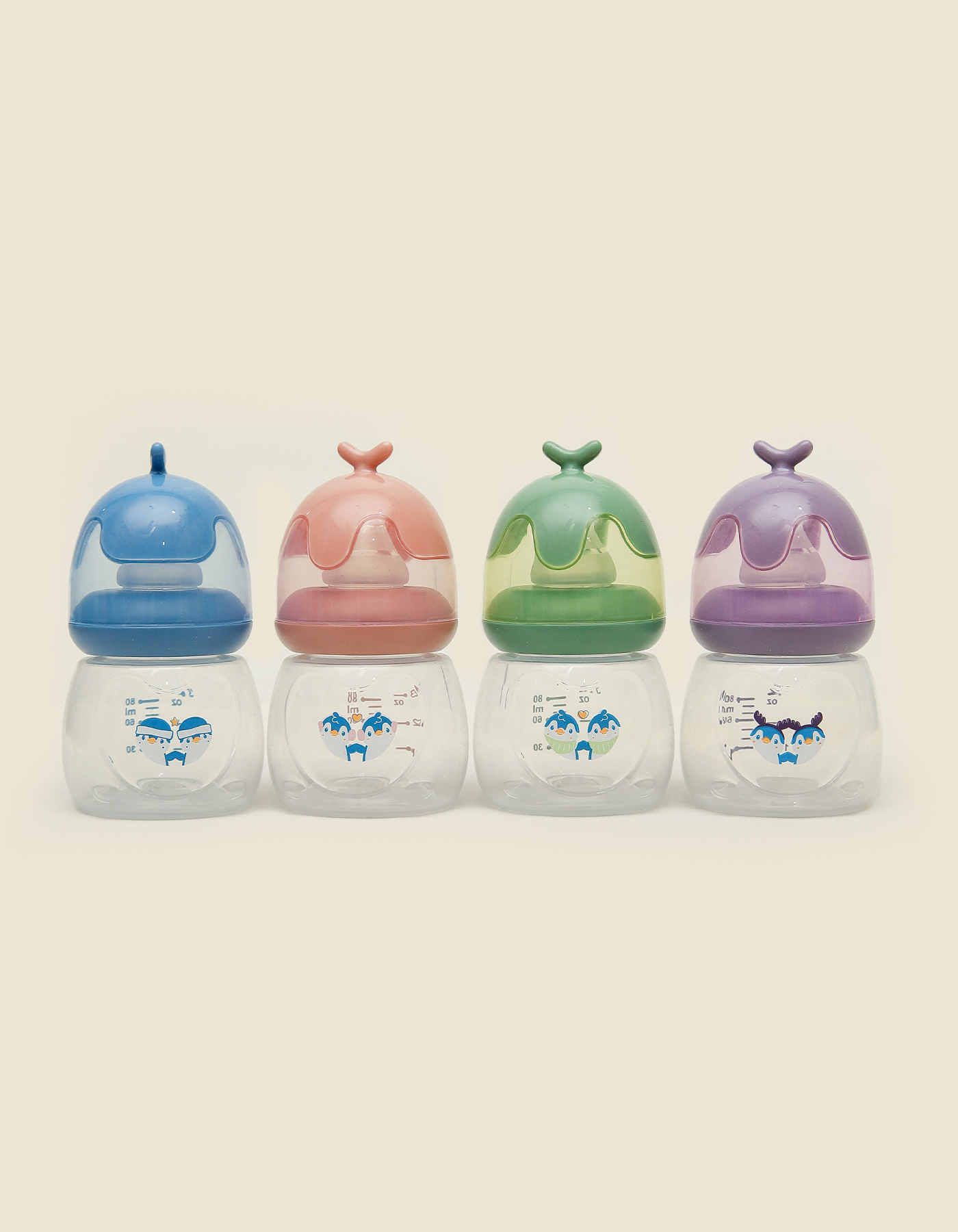 The Minitree Whale Cap Baby Feeding Bottles are a perfect blend of safety, practicality, and playful design, making feeding time fun and stress free. Each bottle features a cute whale shaped cap with a tail fin top and colorful lids in blue, pink, green, and purple, paired with cheerful cartoon prints.