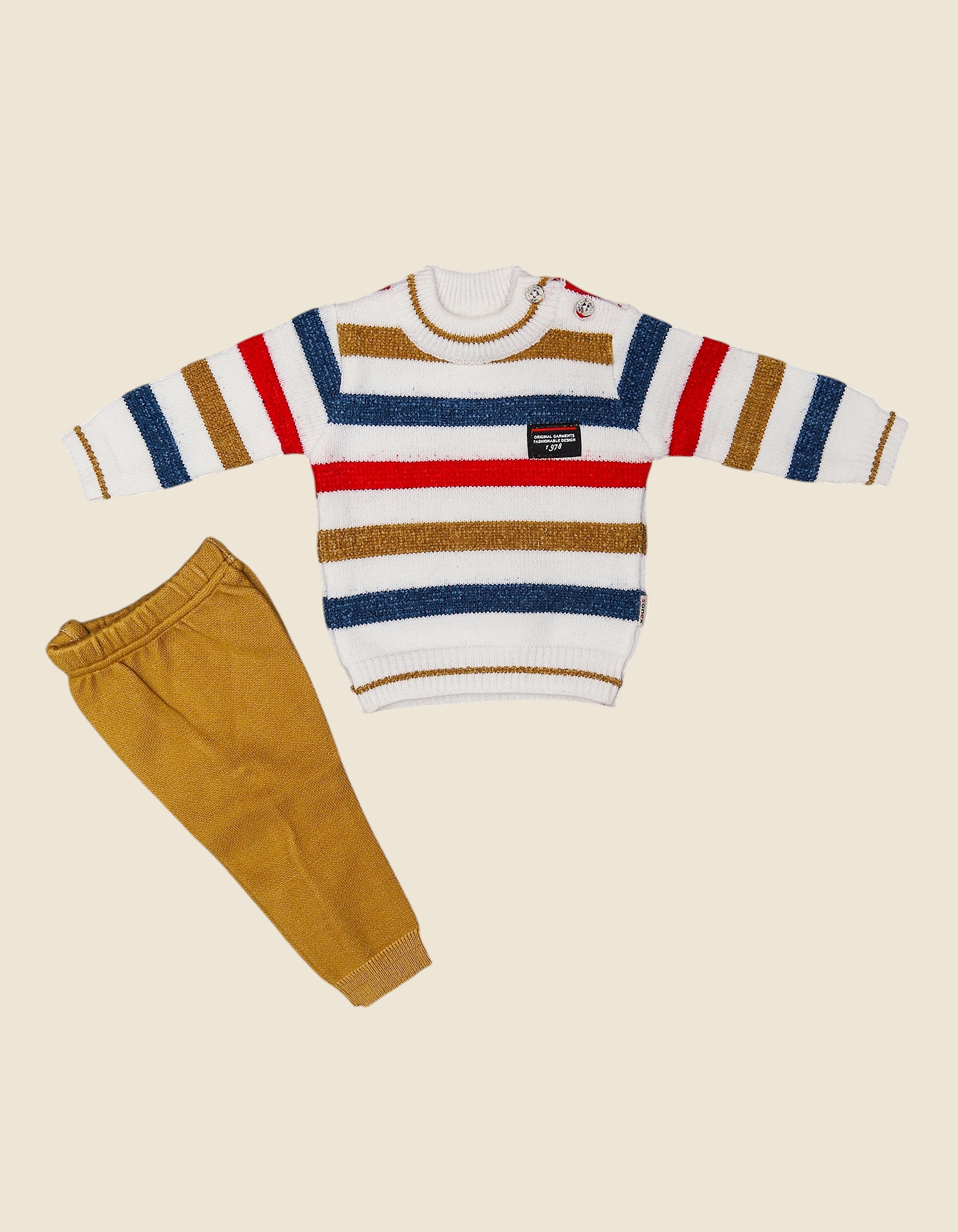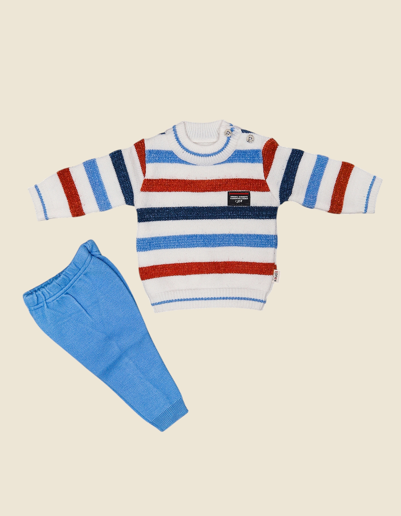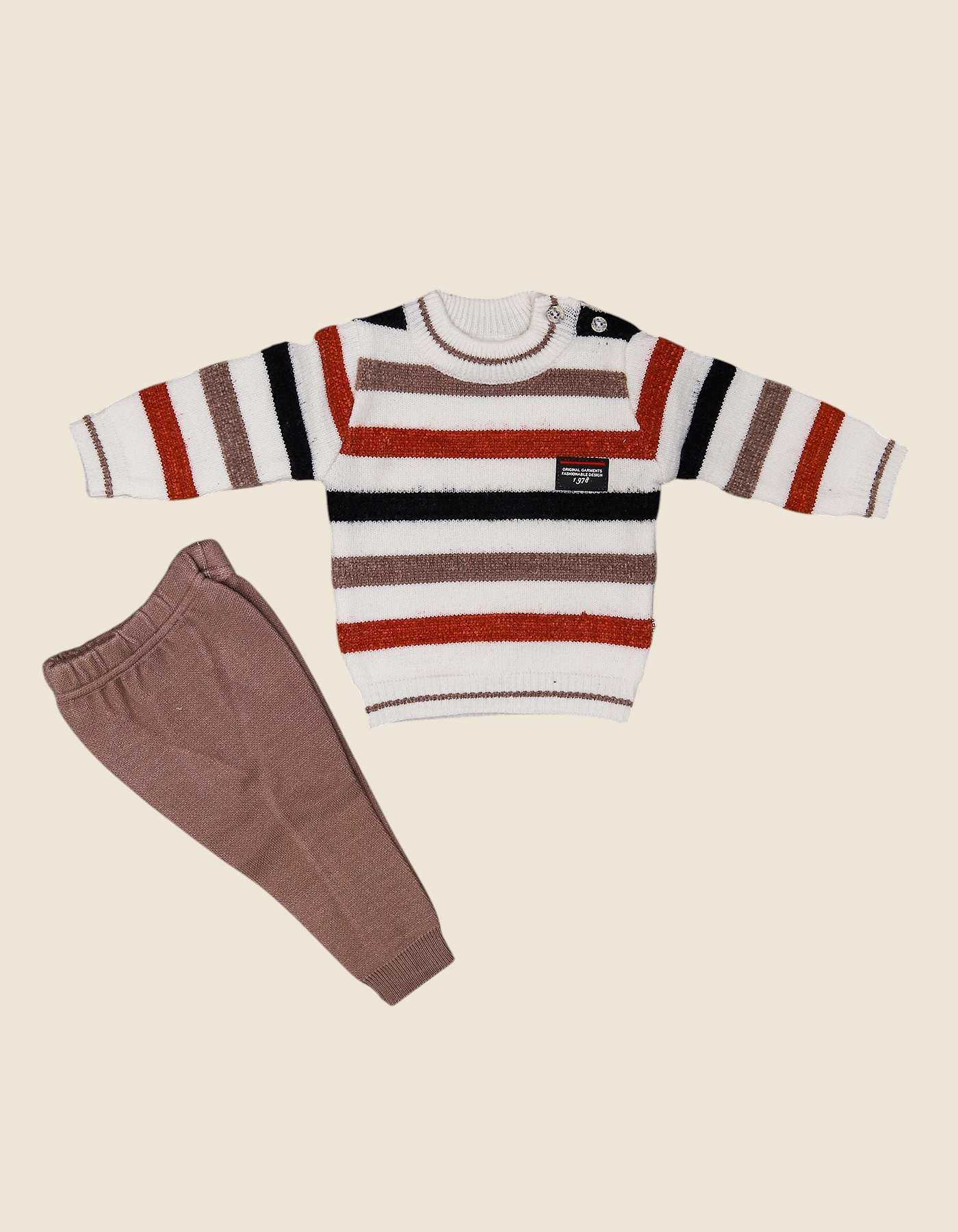 The Newborn Woolen Suit Multi Stripe Design is a stylish and cozy two-piece outfit perfect for keeping your little one warm during the winter season. The set includes a soft woolen sweater with colorful horizontal stripes and shoulder button closure for easy dressing, paired with matching woolen pants. Comfortable, durable, and fashionable, this suit is an ideal choice for daily wear or gifting.