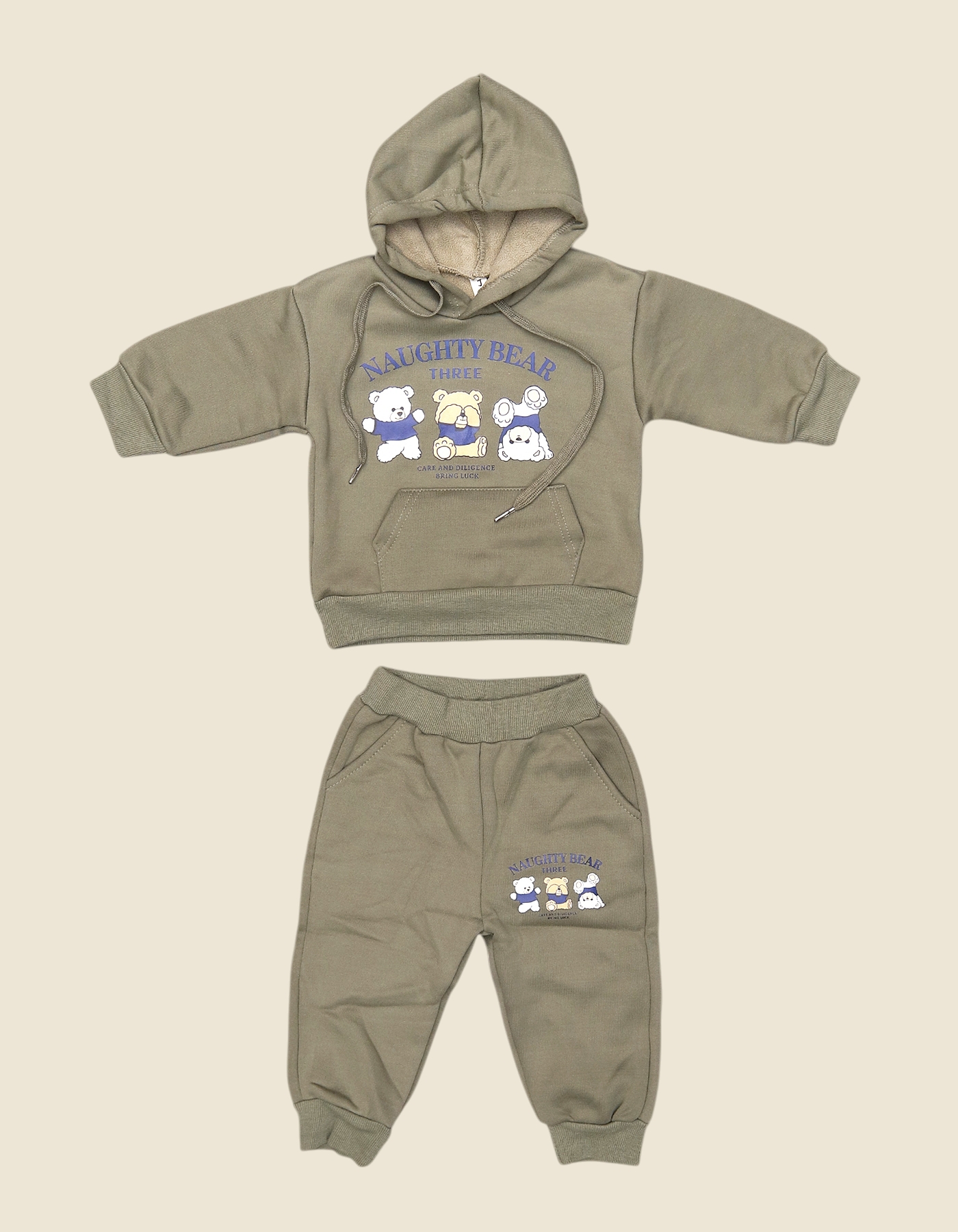 Keep your little one cozy and stylish with this olive green boys fleece suit featuring an adorable Naughty Bear print. Designed with a soft fleece interior, this two-piece set includes a warm hooded sweatshirt and matching jogger pants. Perfect for playtime, outings, or casual wear, it combines comfort, warmth, and fun style in one.