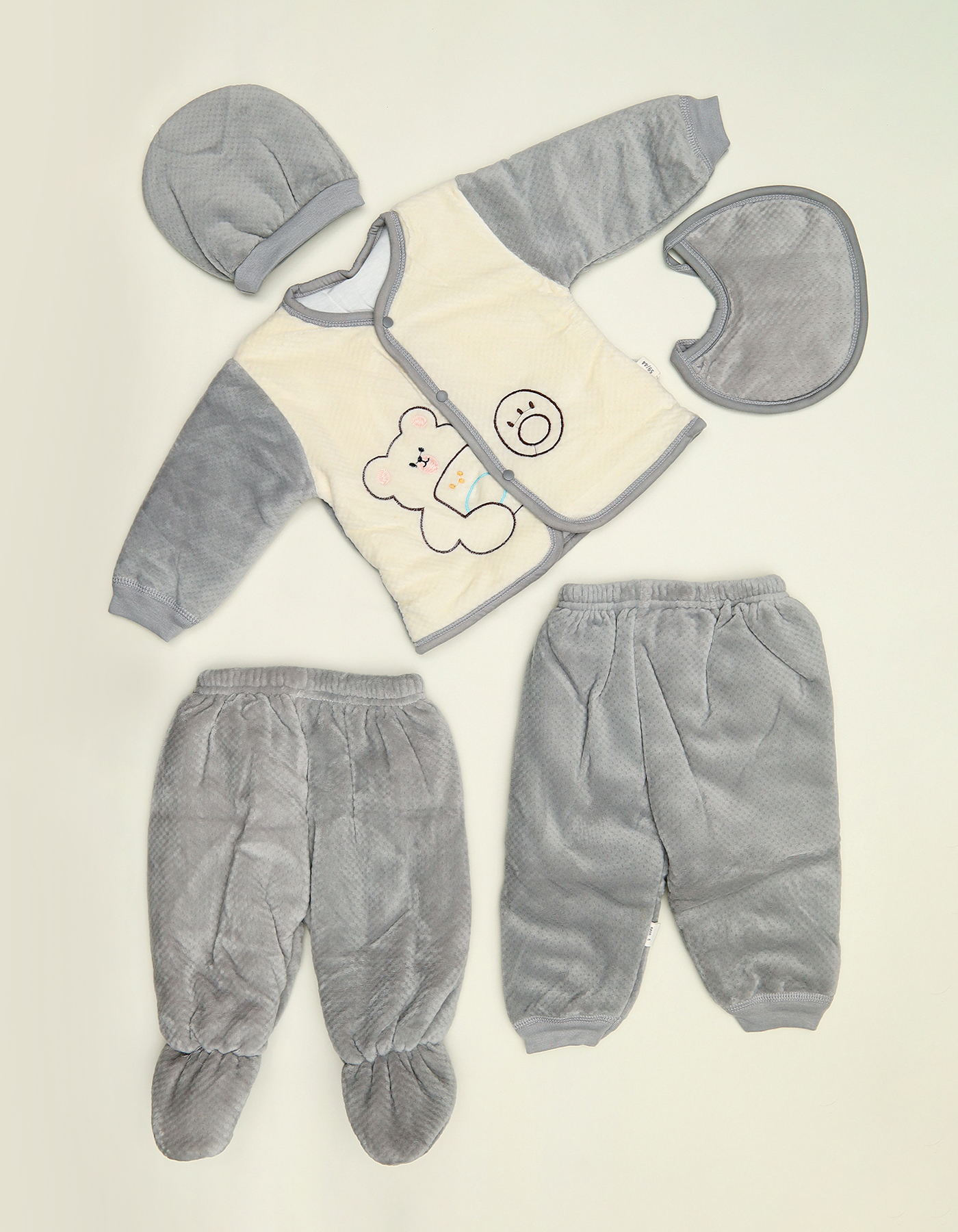 Complete newborn starter set in Sky Blue and Grey. Includes jacket, two pants, bib, and cap. Soft fleece fabric ensures comfort and style for daily wear.