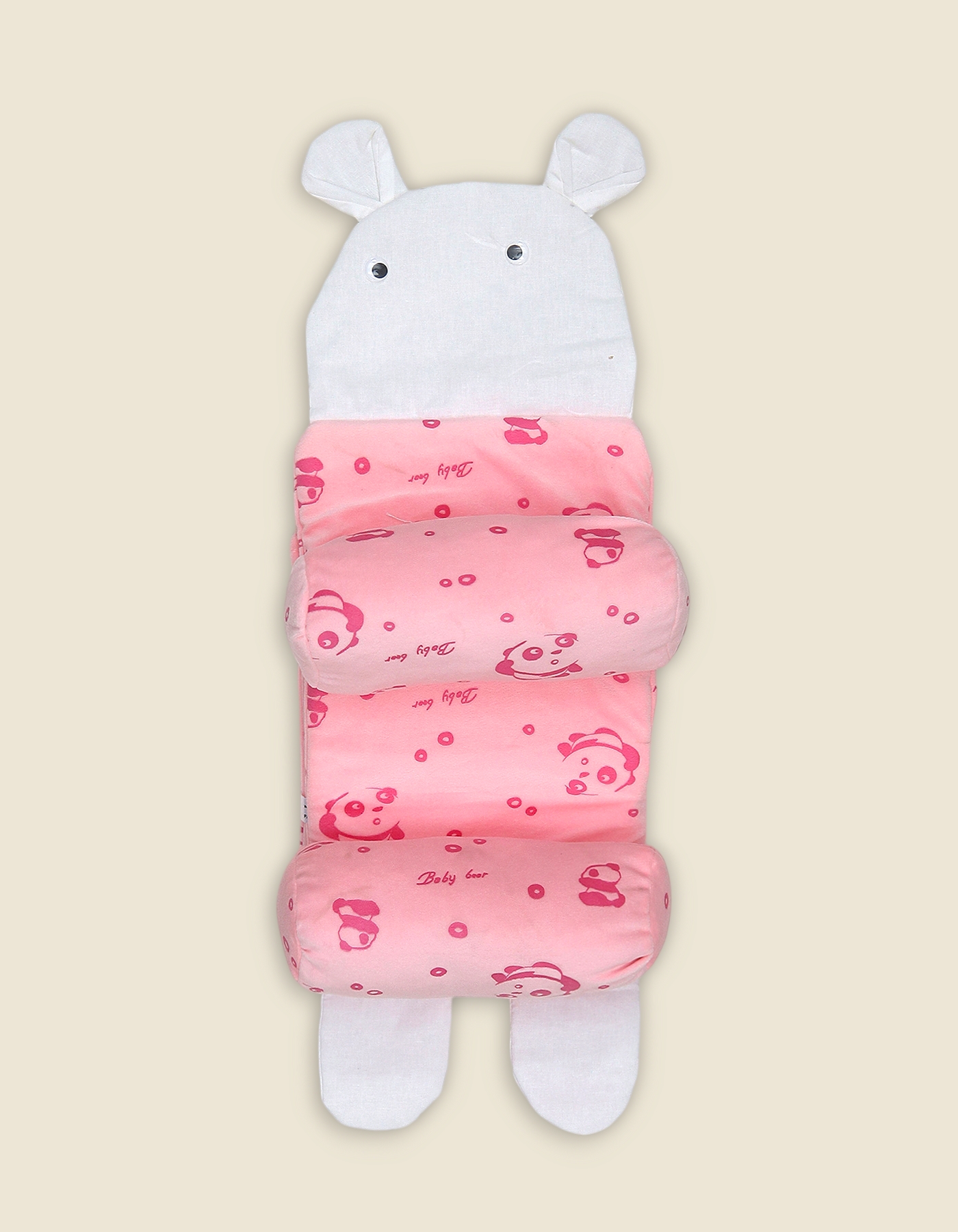 This adorable panda-themed sleep positioner features a cute character head with 3D ears and two adjustable side bolsters to keep your baby snugly in place. The soft, printed fabric features playful "Baby Bear" and panda motifs, providing a secure and cozy environment for naptime.