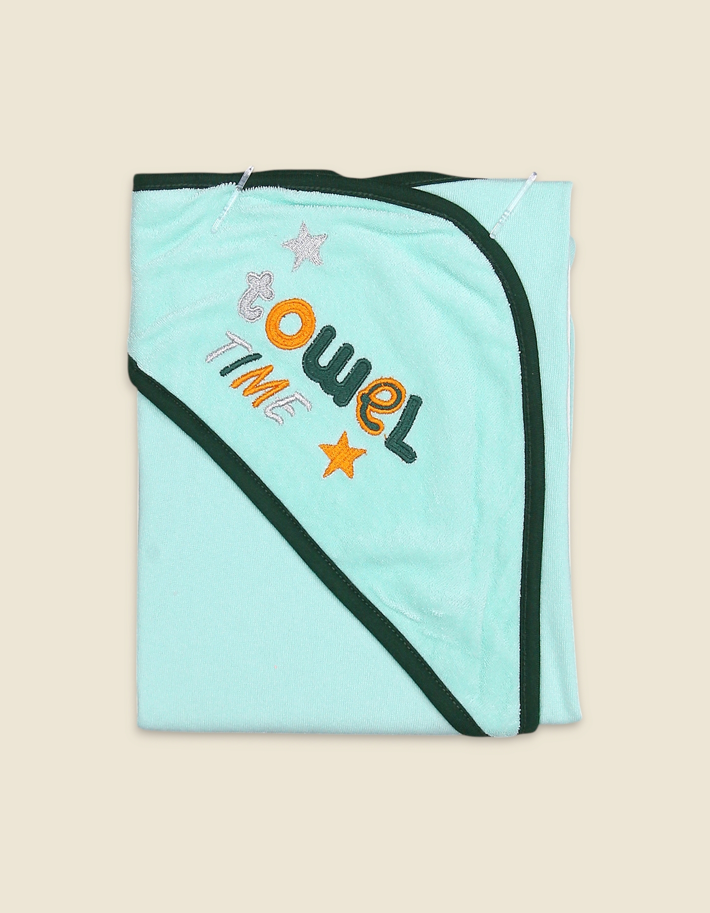 Make bath time fun and cheerful with this mint green hooded bath towel, decorated with playful Towel Time embroidery and colorful stars. Crafted from soft, absorbent fabric, it keeps your baby cozy and dry while protecting delicate skin. The hooded design ensures extra warmth and comfort, making it perfect for daily use or gifting.
