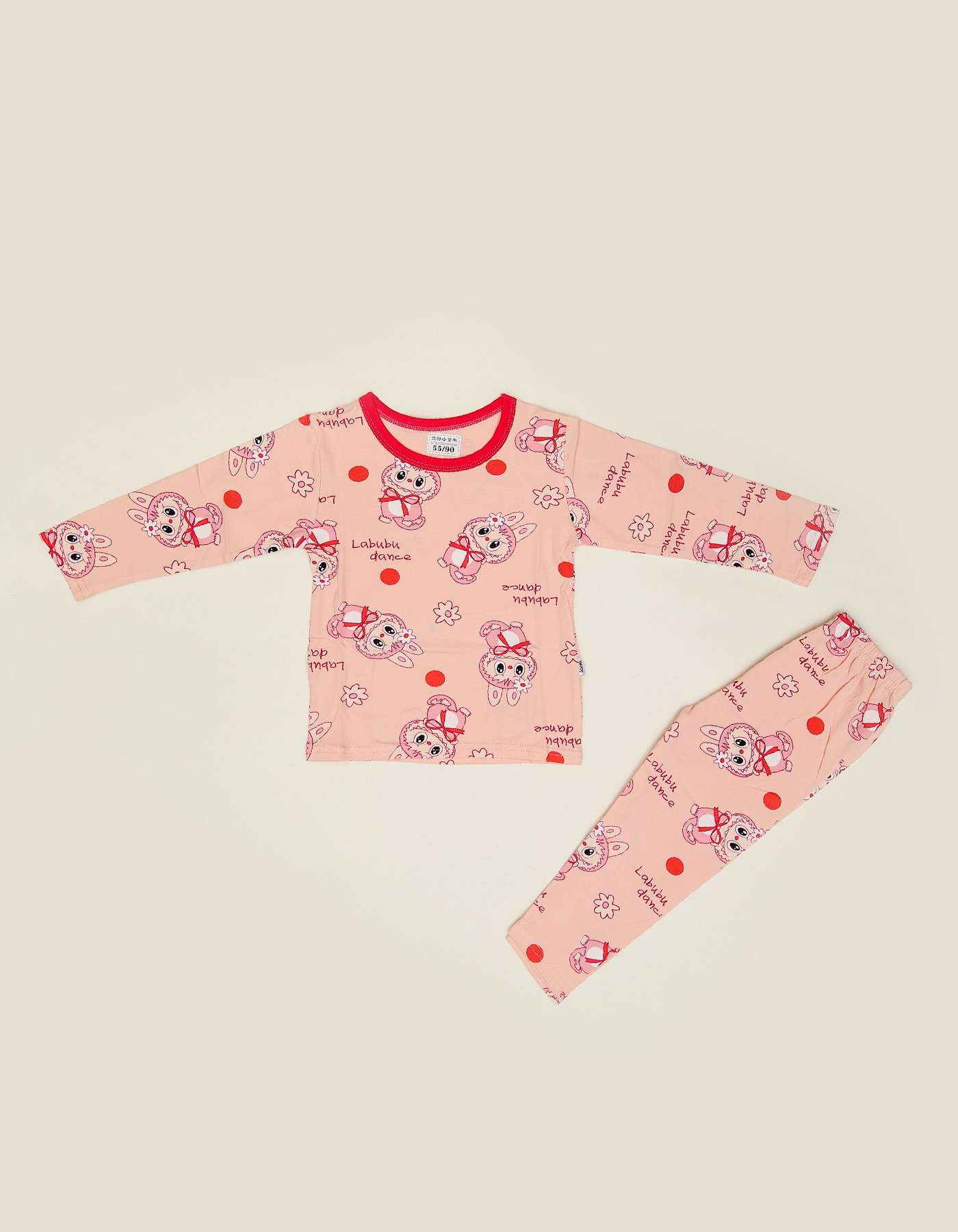 Brighten up bedtime with this adorable Peach Bunny Dance pajama set. Designed in a peachy-pink shade with a contrasting red neckline, it features playful bunny characters, cheerful flowers, and polka dots for a fun look. Made from soft, breathable fabric with a comfy elastic waistband, this pajama set is perfect for keeping your little one cozy during sleep or relaxed during playtime at home.