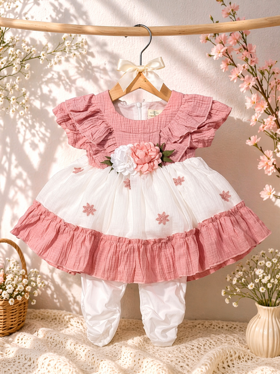 Dress your little princess in timeless elegance with this Peach & White Floral Ruffle Party Frock Set. Designed with a soft peach textured bodice featuring stylish ruffle sleeves, this adorable outfit is beautifully complemented by a flowy white skirt adorned with delicate floral embroidery. The charming flower applique at the waist adds a sweet, eye-catching touch, making it perfect for special occasions. The layered skirt with soft gathers creates a graceful flare, while the matching white leggings ensure comfort and easy movement throughout the day. Crafted from soft, breathable fabric, this outfit keeps your baby girl comfortable while looking picture-perfect.