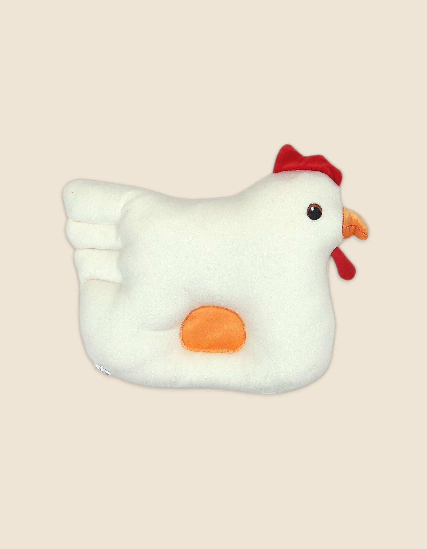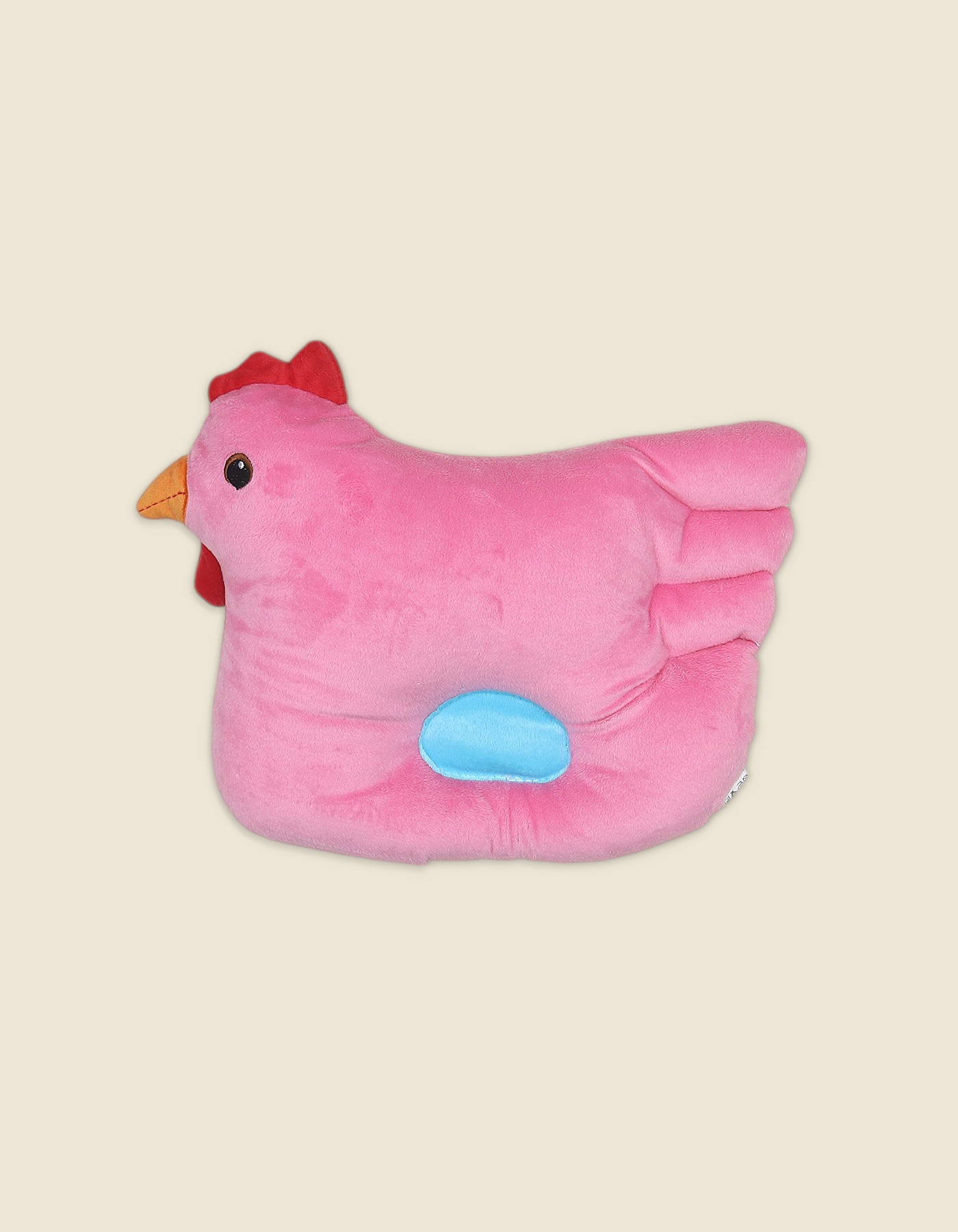 Soft and colorful chicken shaped pillow made with plush fabric. Designed in pink with a red comb, orange beak and blue side patch. Perfect for kids room, cuddling or decoration.