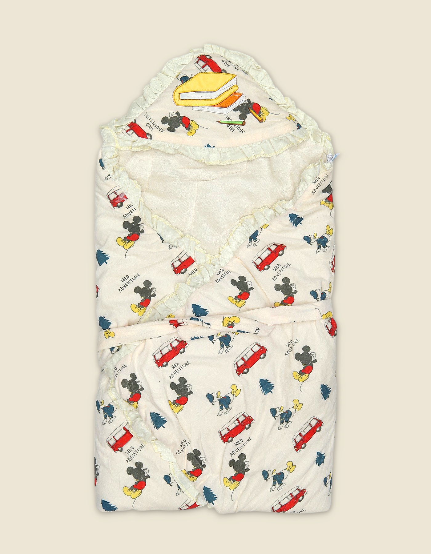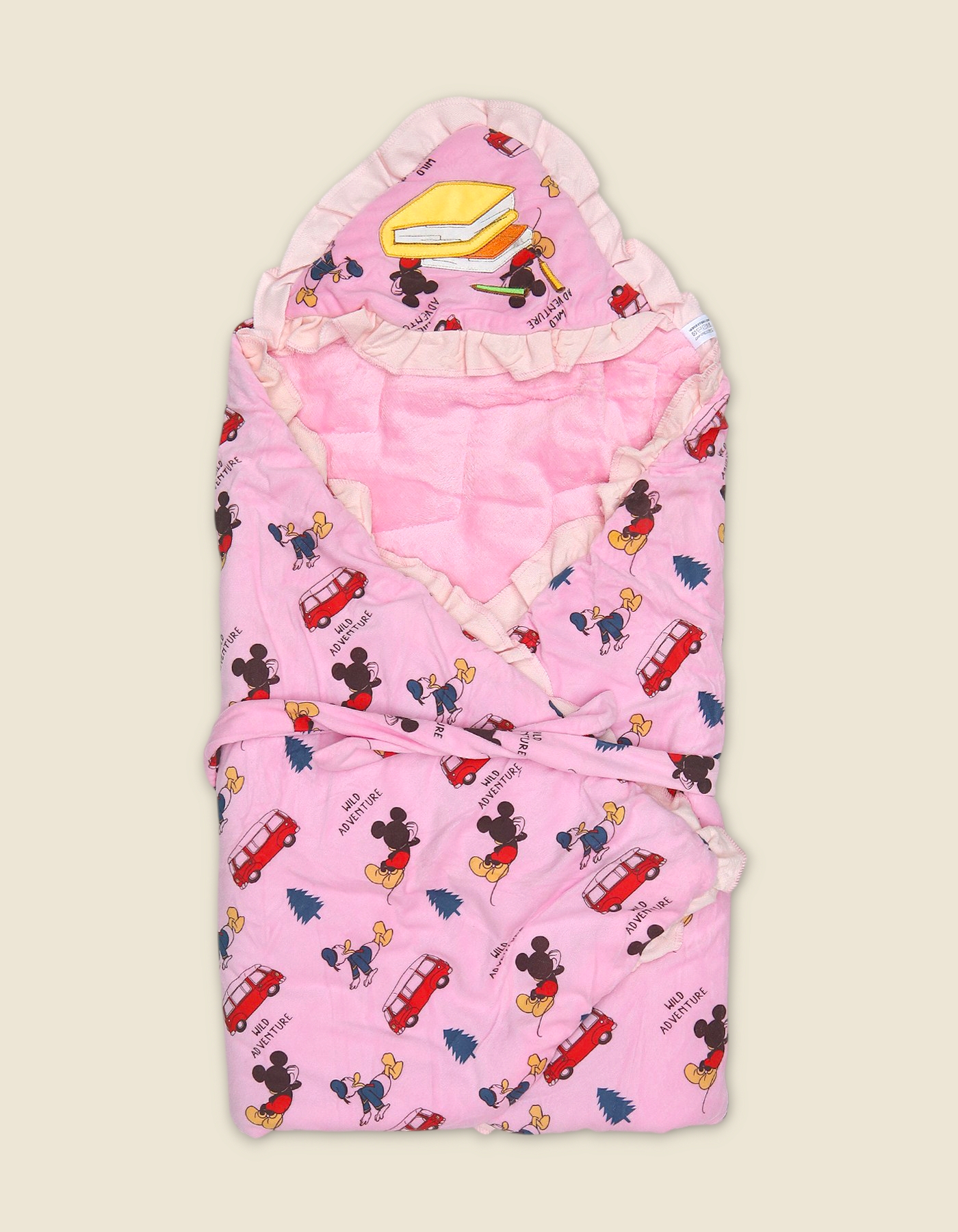 Soft plush hooded baby wrap designed to keep newborns snug and comfortable with an adorable printed exterior and gentle inner lining.