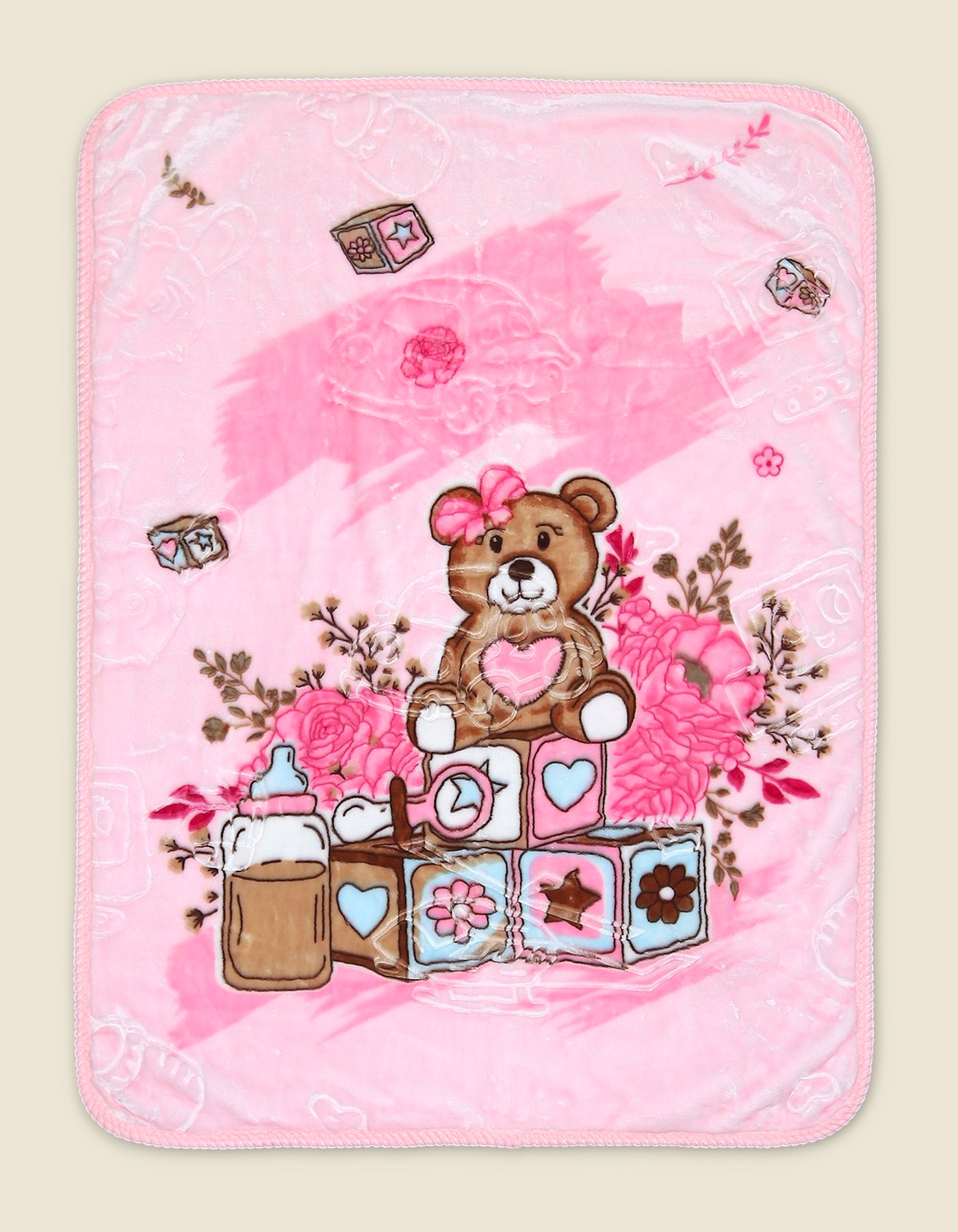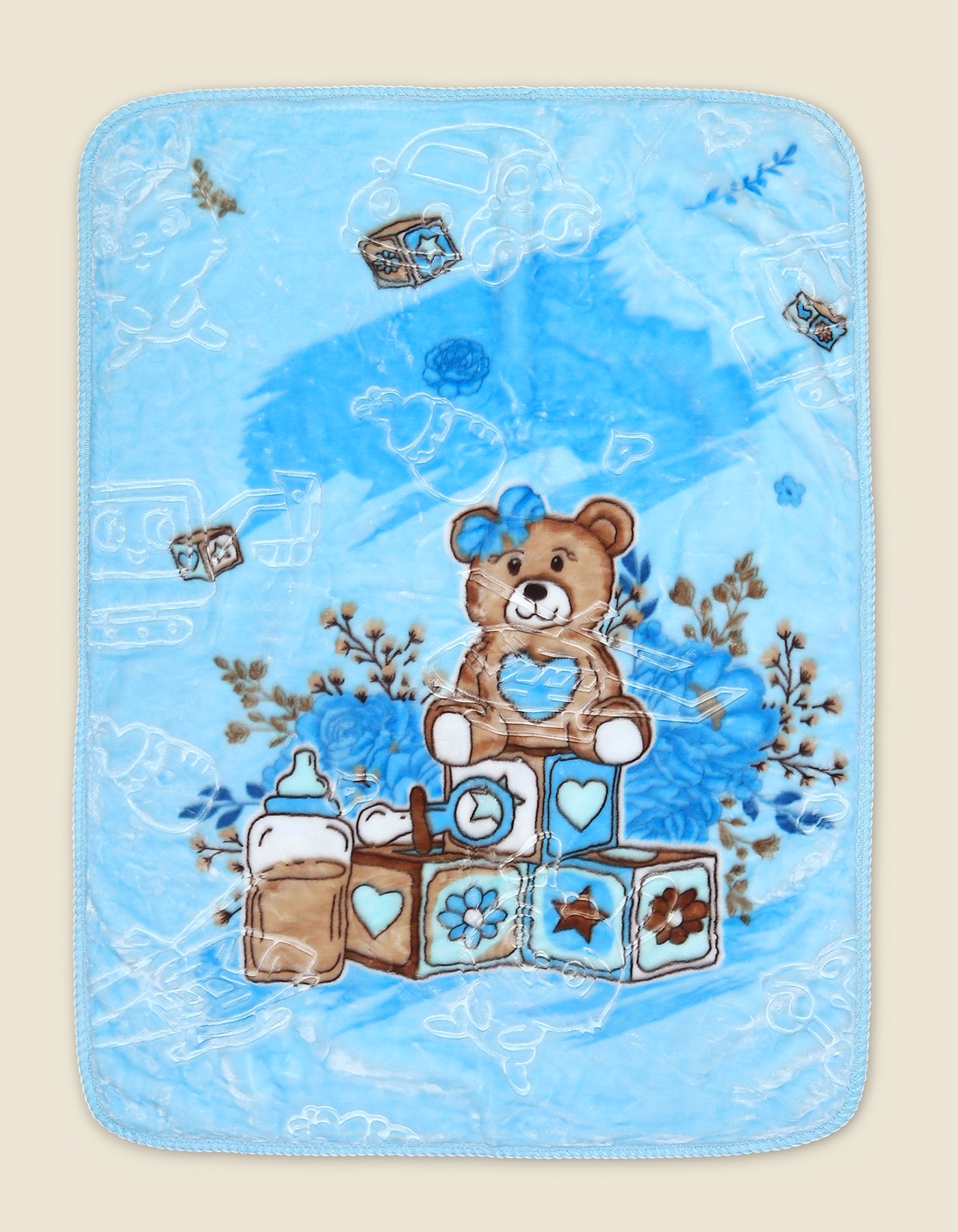 Comfortable and cozy baby blanket with teddy bear and toy block design in soft blue tones. Perfect for nursery crib or gifting.
