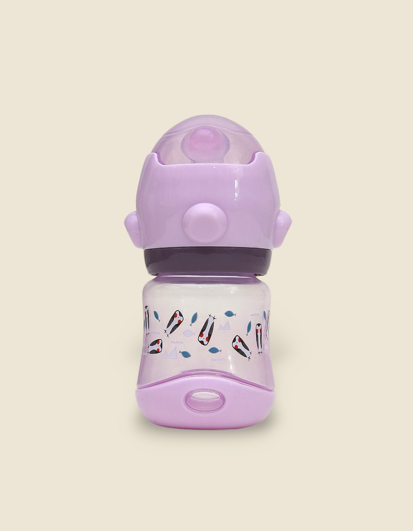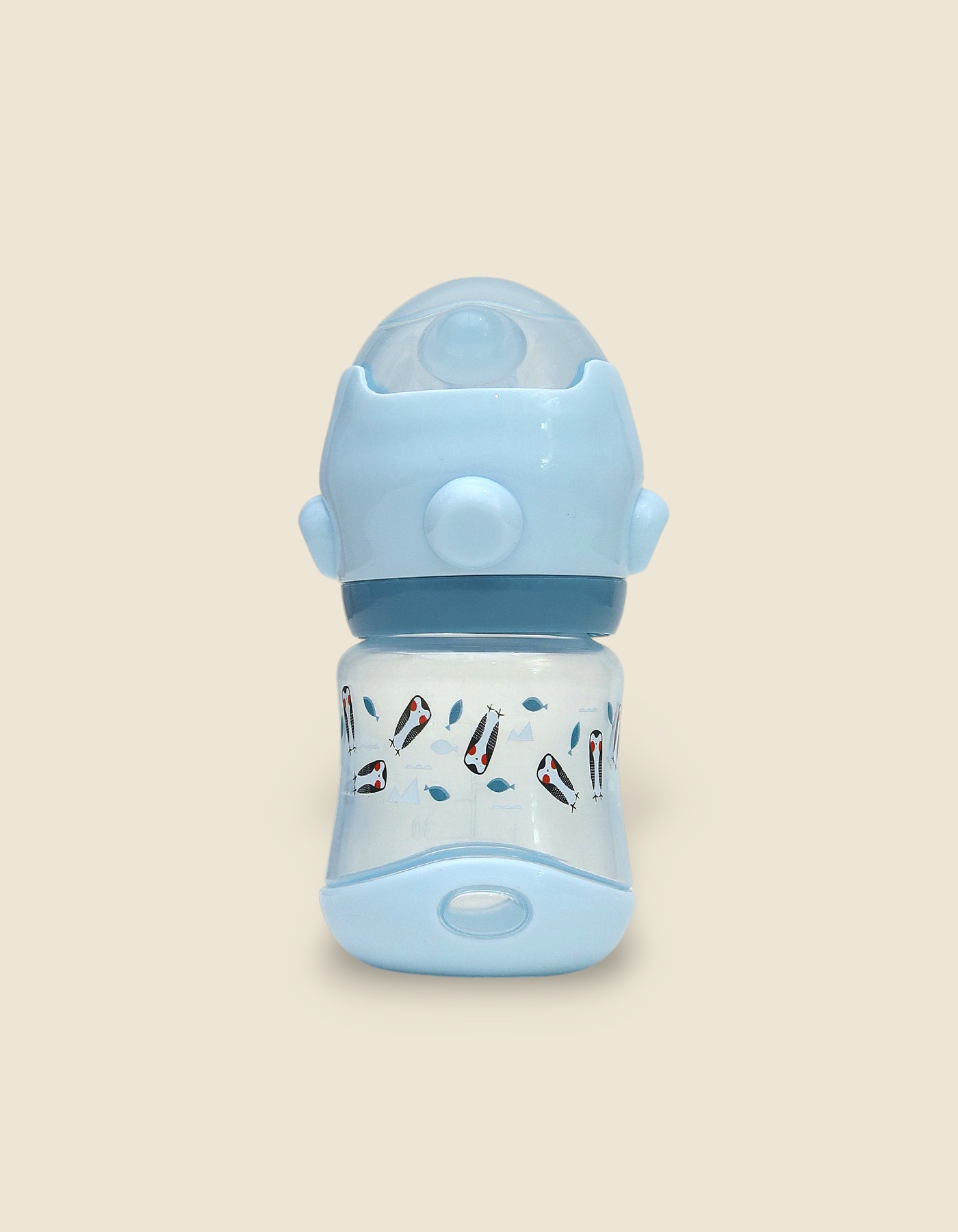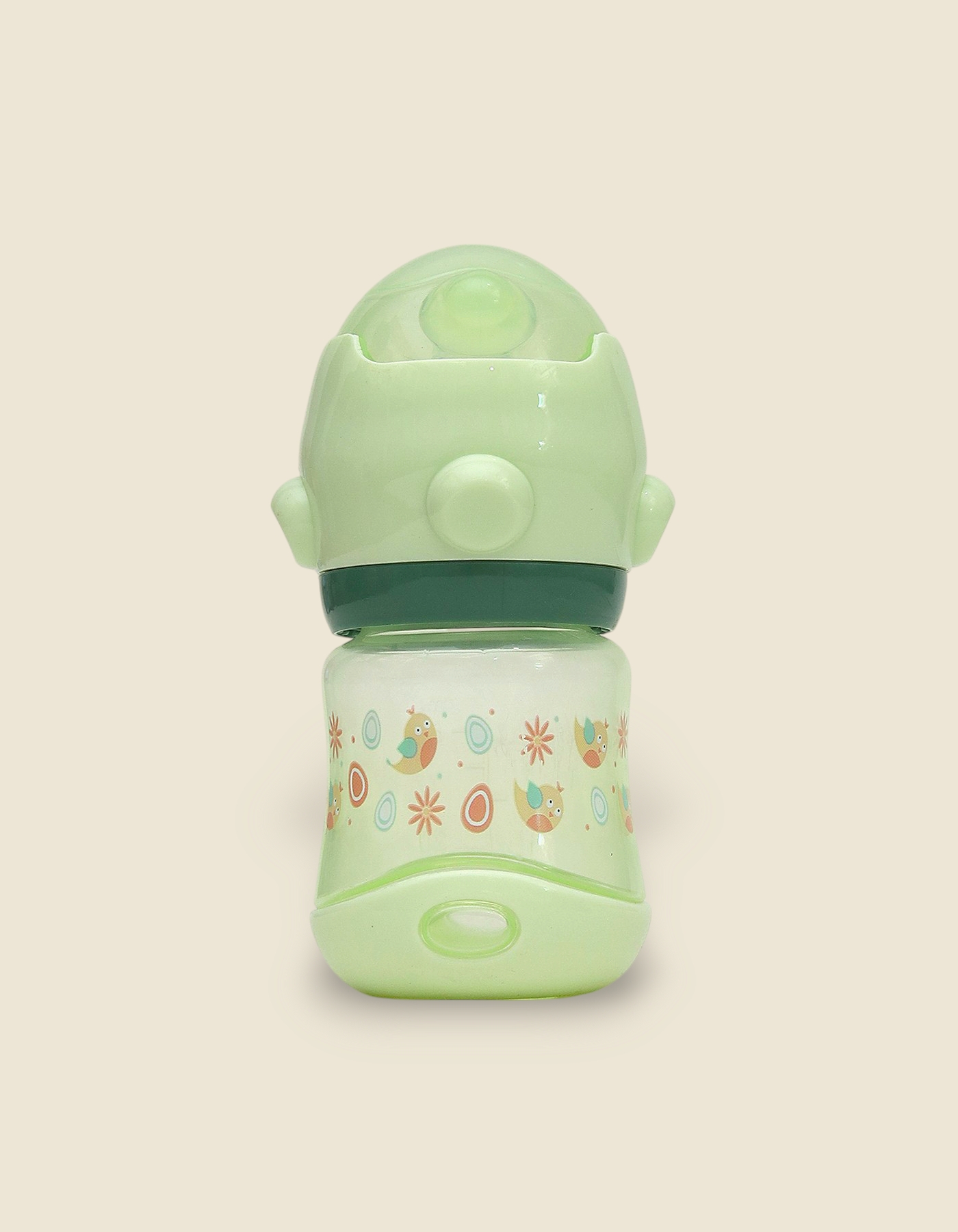 Playful Patterning: The bottles are decorated with charming, repeating nature-inspired prints, including small birds, floral elements, and stylized fish patterns.