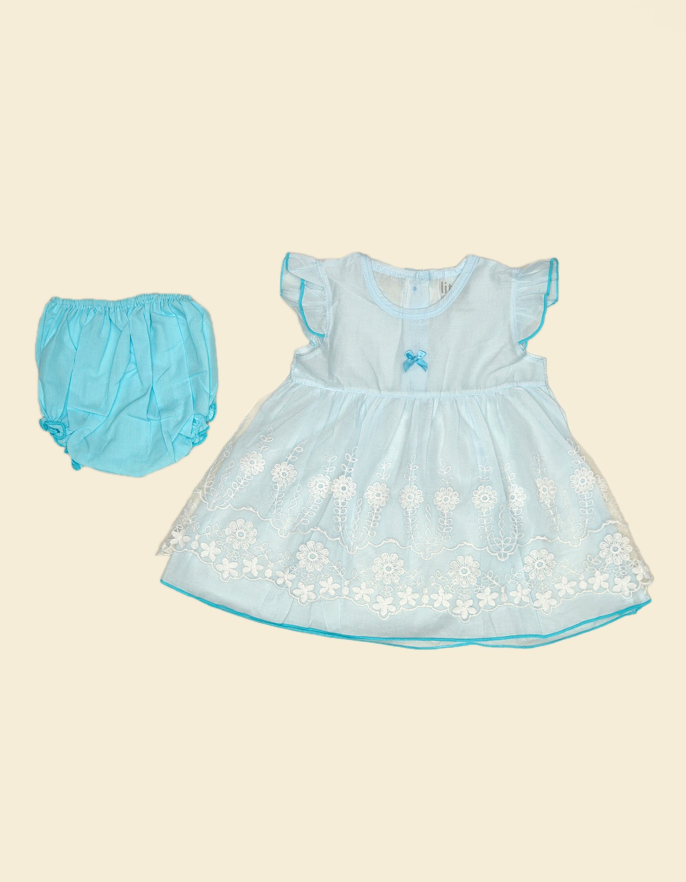 Make your little girl shine with this elegant baby party dress, perfect for birthdays, weddings, and special occasions. The soft, lightweight fabric ensures comfort, while the delicate floral embroidery and ruffled sleeves add a touch of charm. Comes with a matching bloomer for a complete outfit. Available in 6 beautiful colors to match every occasion.