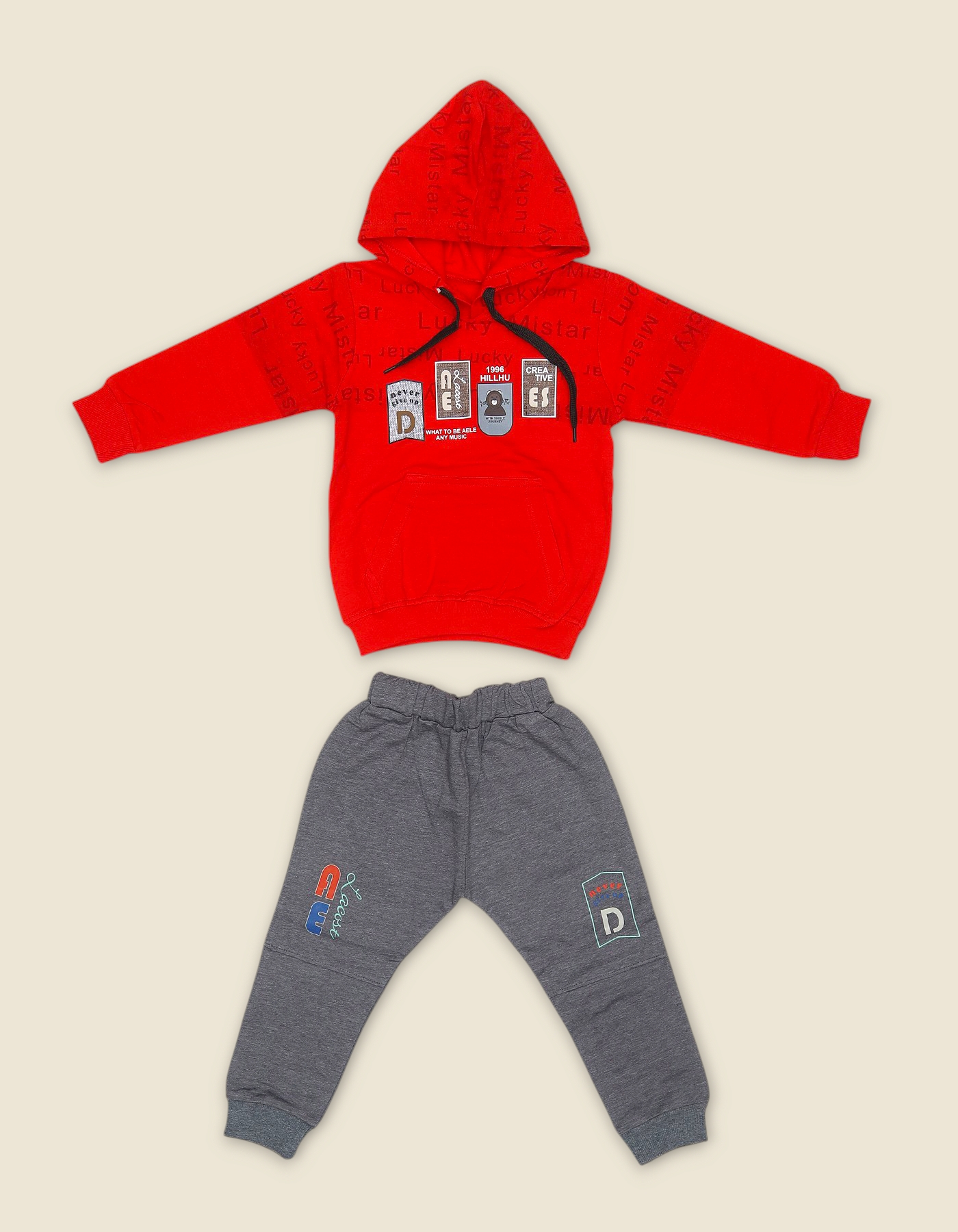 Comfortable baby outfit with hooded sweatshirt and matching pants. Features bold printed letters and coordinated design for a trendy look.