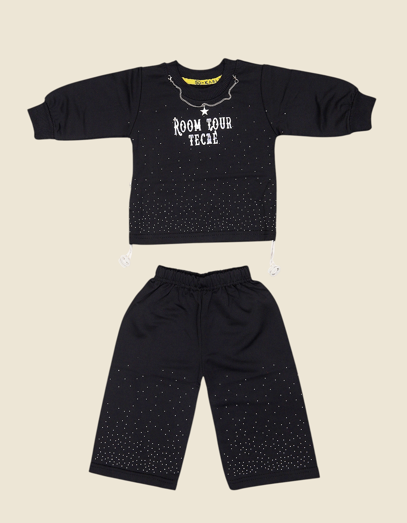 The Room Tour Sparkle Baby Outfit Set adds a trendy and stylish vibe to your little one everyday look. Featuring a long-sleeve sweatshirt with glittery rhinestone-style accents and matching wide-leg pants, this outfit is both fashionable and comfortable. Designed with soft, breathable fabric, it perfect for casual outings, parties, or cozy home wear. Available in Black and Red colors.