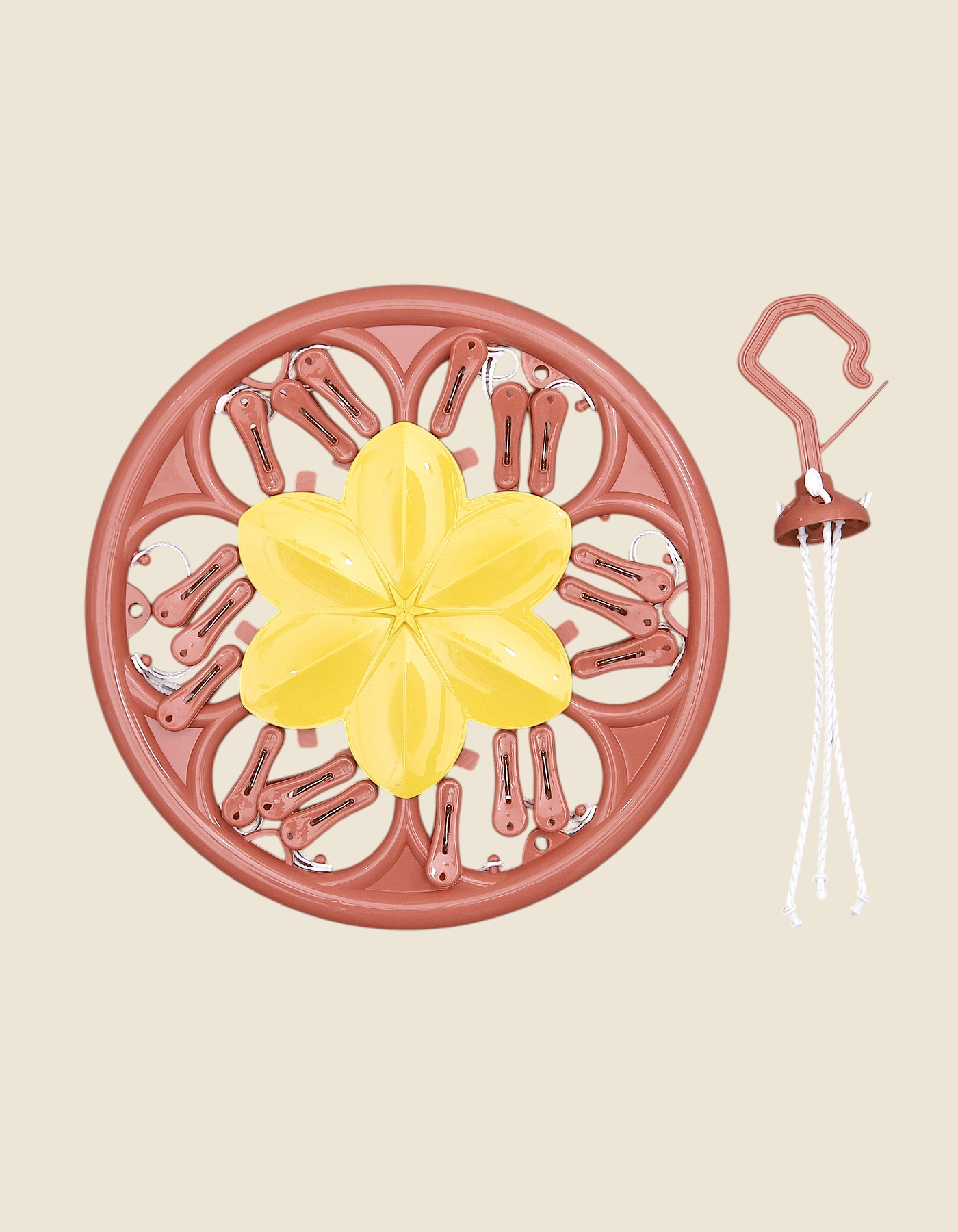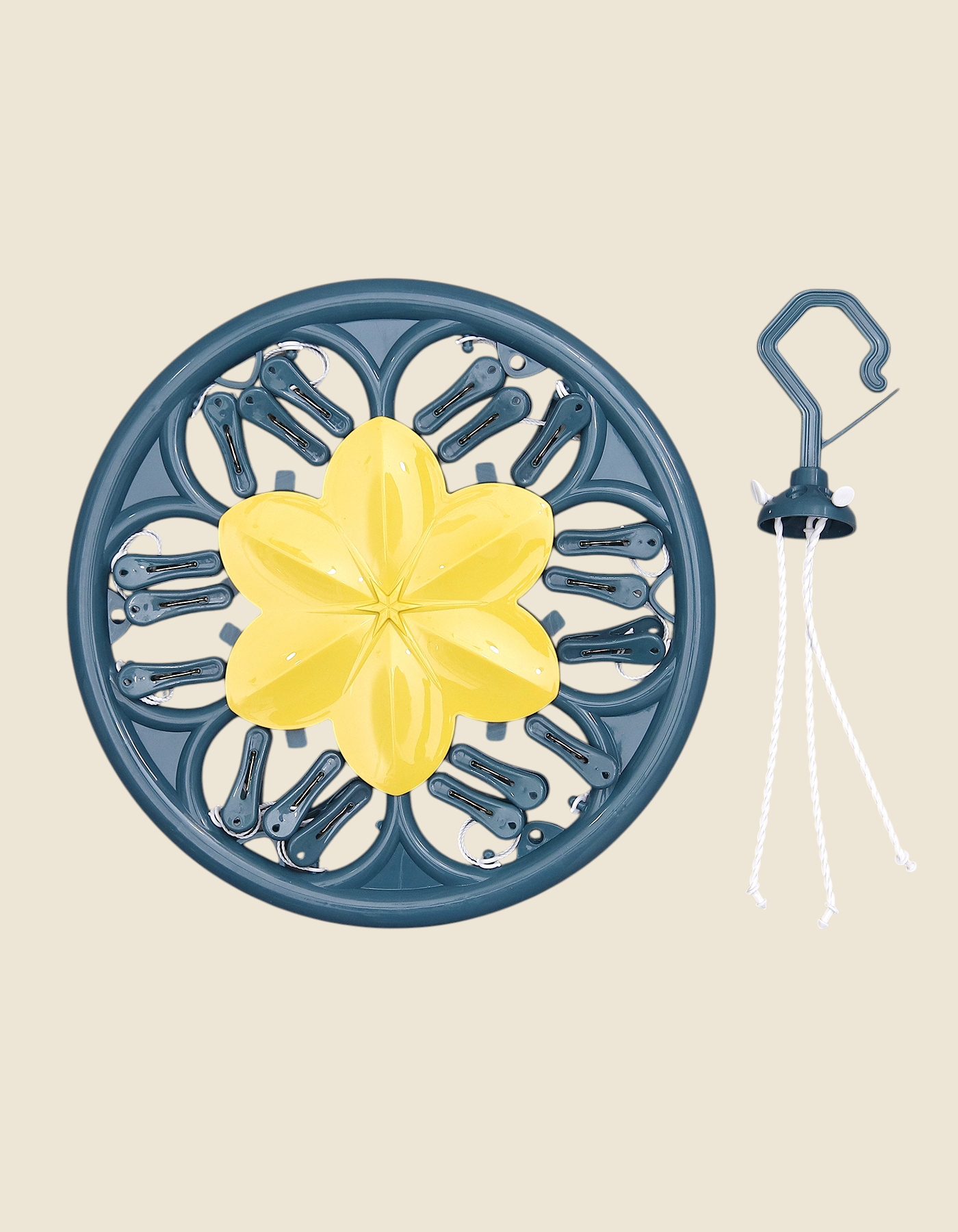 The Rotating Flower Clip Hanger is a smart and space-saving solution for drying clothes, socks, undergarments, baby items, and small laundry essentials. Designed with a floral center design and 12 strong clips, this hanger ensures secure hold and even drying. It comes with a rotating hook and pull cord for easy hanging anywhere indoors, outdoors, balconies, or bathrooms. Made from durable, high-quality plastic, it is lightweight yet strong, available in Blue and Brown color options.