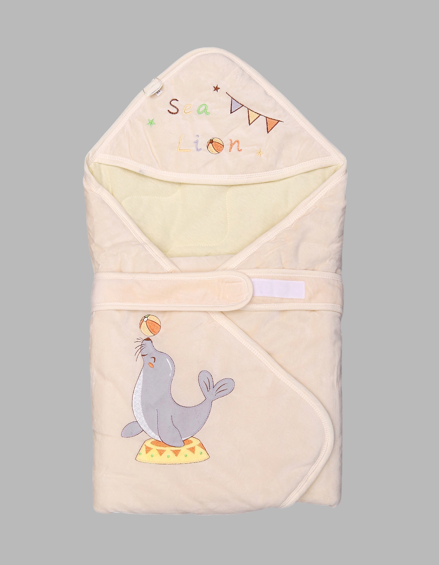 The Baby Fleece Hooded Shawl is designed to provide warmth, comfort, and style for your little one. Made from soft, breathable fleece material, it keeps babies cozy without overheating. Featuring an adorable Sea Lion embroidery with playful ball detail and colorful Sea Lion stitched text, this hooded shawl is both fun and practical. With its hooded design for extra warmth and velcro strap closure for a snug fit, its perfect for swaddling, stroller naps, or travel.
