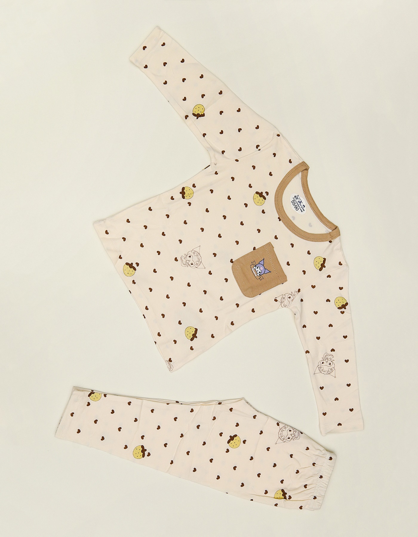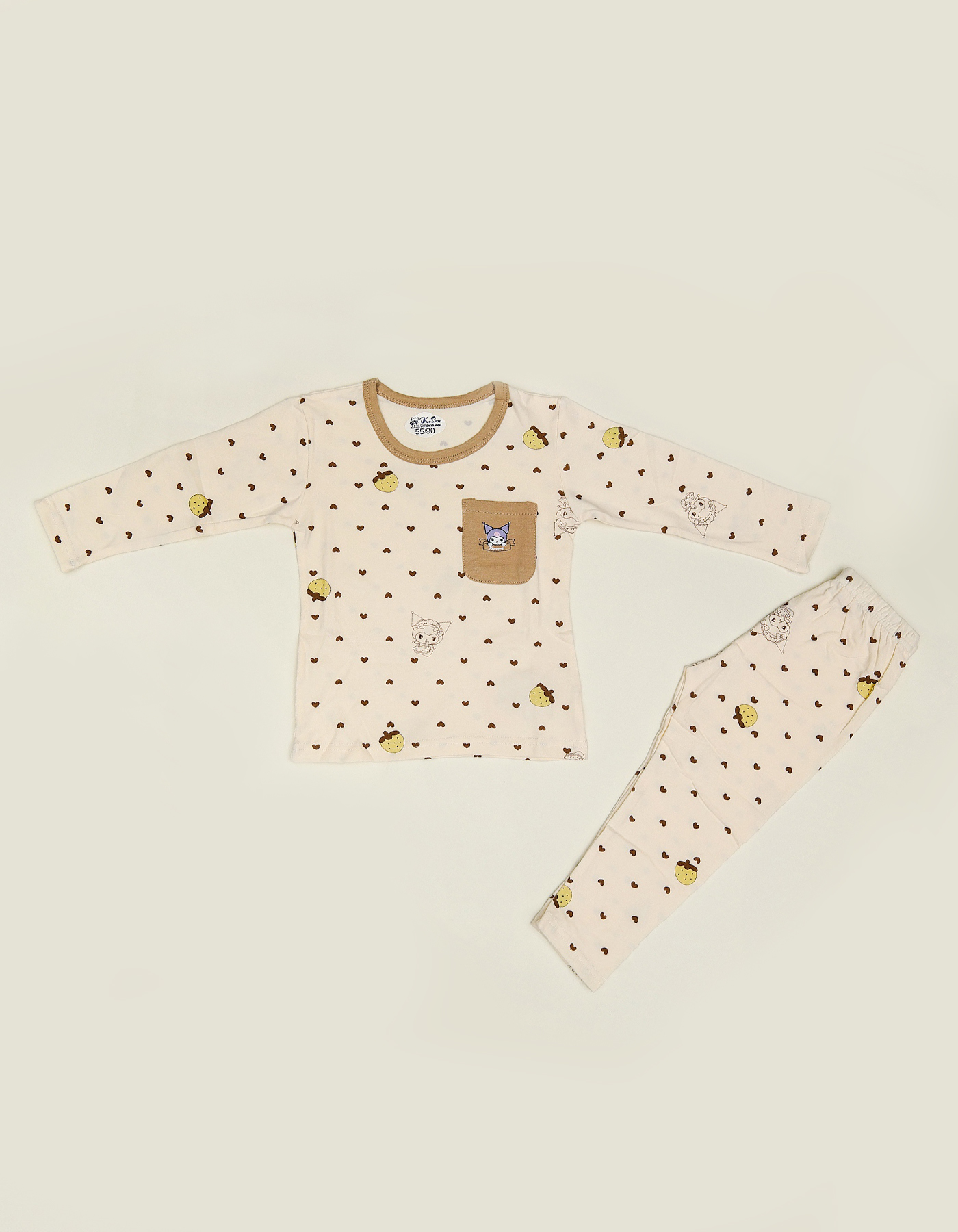 Make bedtime cozy and playful with this Skin Cartoon Print Girls Suit. Featuring cute little cartoon faces and heart patterns all over, the set includes a full sleeve top and matching bottoms. A stylish chest pocket with character embroidery adds extra charm. Crafted from soft, breathable fabric, this set ensures comfort all night long, making it perfect for sleep, lounging, or indoor play.