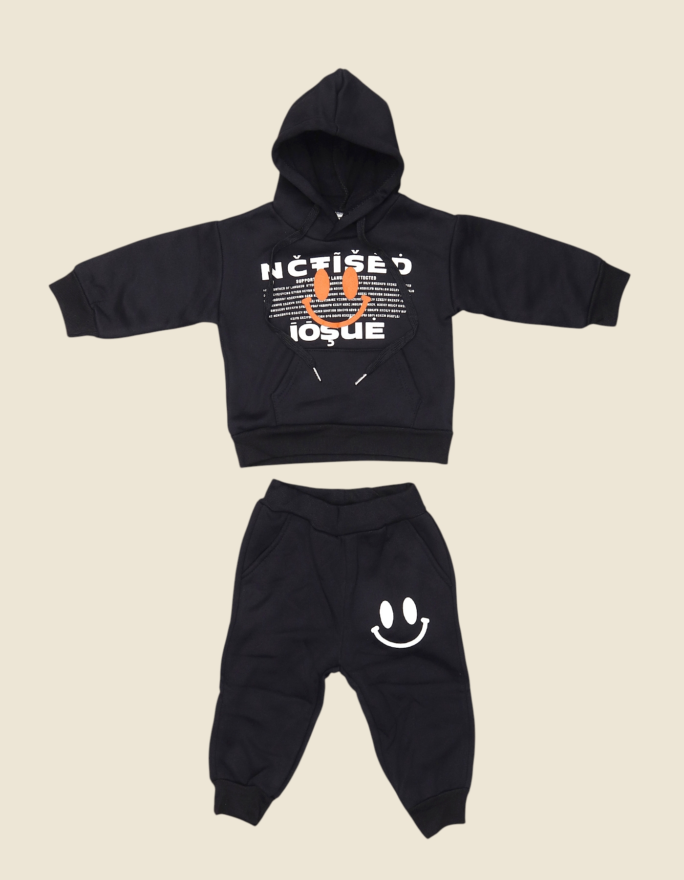 Give your little one a trendy, cozy look with this black fleece hoodie and jogger set. Featuring a bold graphic print on the hoodie and a cheerful smiley design on the joggers, this 2-piece outfit is perfect for casual wear, playtime, or lounging. The soft fleece fabric ensures all-day comfort while keeping him warm and stylish.