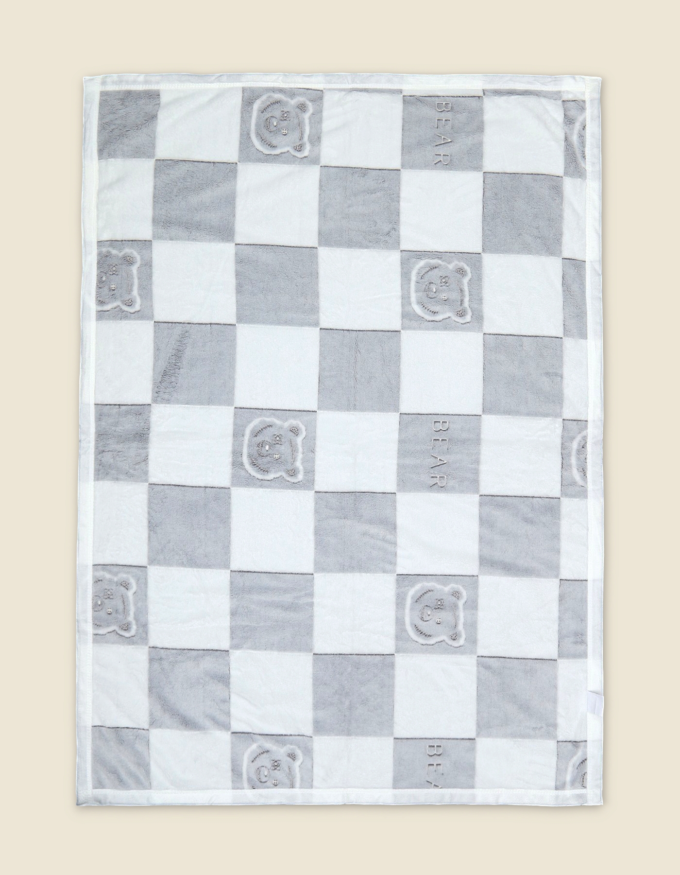 Cozy lightweight baby blanket featuring a classic gray and white check pattern with subtle embossed bear faces. Gentle on delicate skin and perfect for everyday use, stroller rides, or nursery decor.