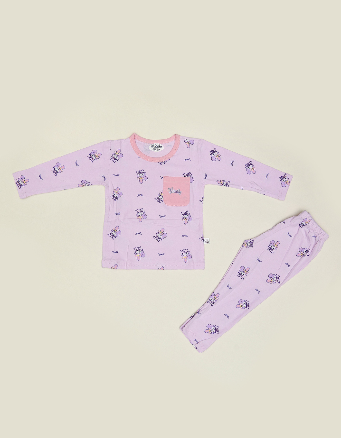 Add a touch of charm to bedtime with this Purple Cartoon Girls Suit. Designed with adorable cartoon mouse and bow prints, the set includes a comfy long sleeve top and matching pajama bottoms. A pink chest pocket adds a cute, stylish detail. Made from soft, breathable fabric, this pajama set ensures cozy comfort for sleeping, lounging, or playful evenings at home.