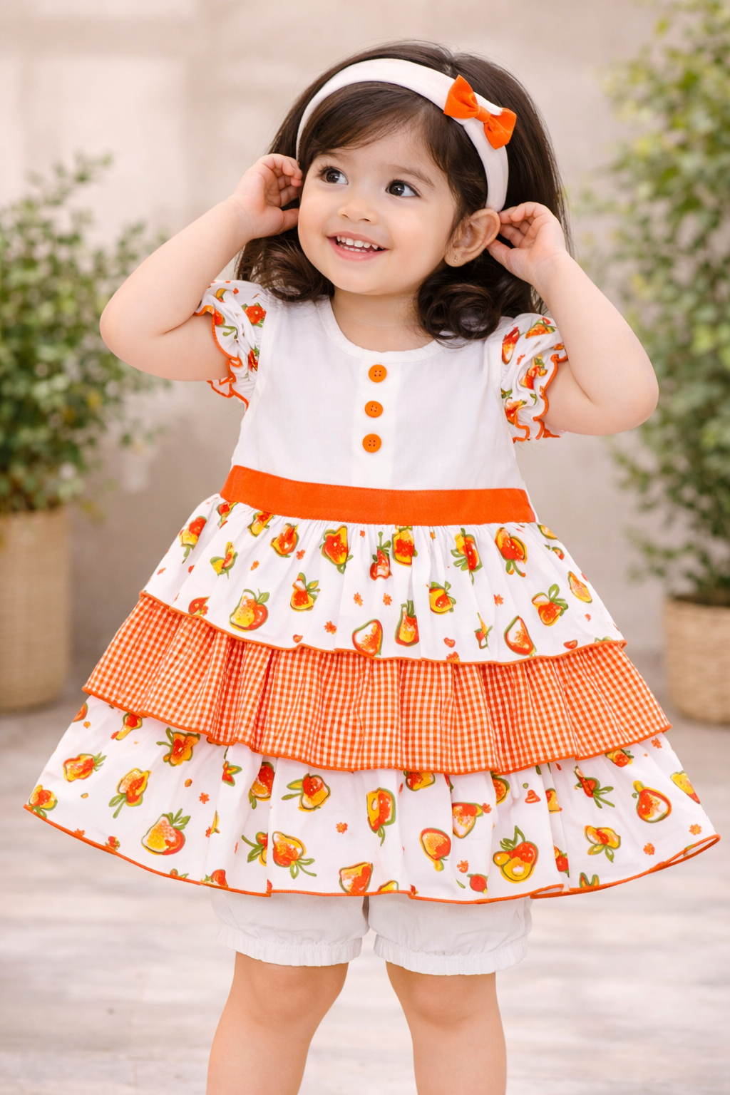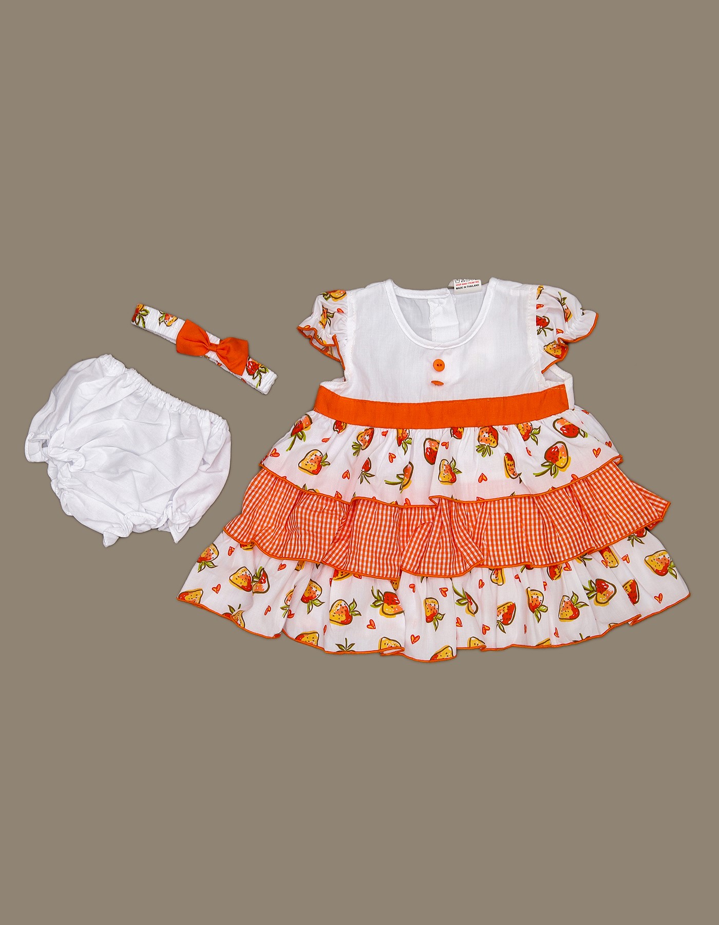 Dress your little one in pure cuteness with the Strawberry Charm Baby Frock Set in vibrant orange. This adorable 3-piece set includes a frilly frock with a playful strawberry print, matching bloomers, and a sweet headband for a coordinated look. Made from soft, breathable fabric, it’s perfect for keeping your baby stylish and comfy all day.
