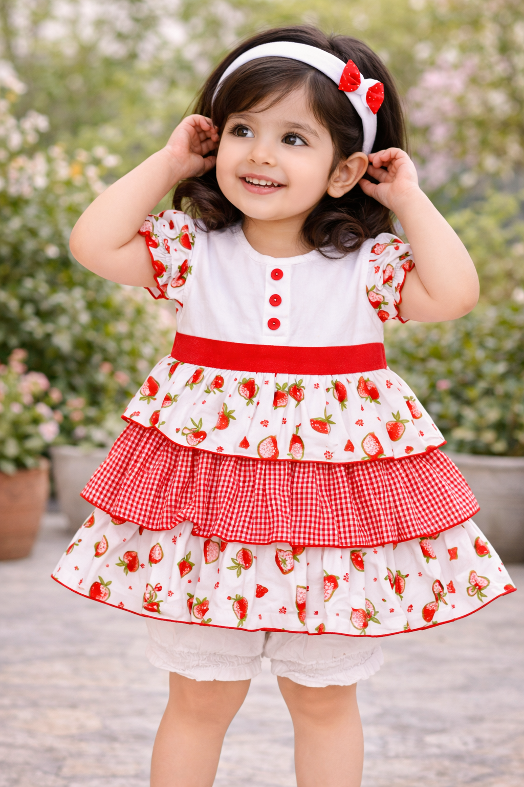 Bring out the sweetness in your little one with this Strawberry Charm Baby Frock Set in a striking red shade. This 3-piece outfit includes a beautifully layered frock with cute strawberry prints, a matching diaper cover, and an adorable bow headband. Crafted with soft, breathable fabric, this set ensures both comfort and cuteness for your baby, perfect for parties, photoshoots, and everyday charm.
