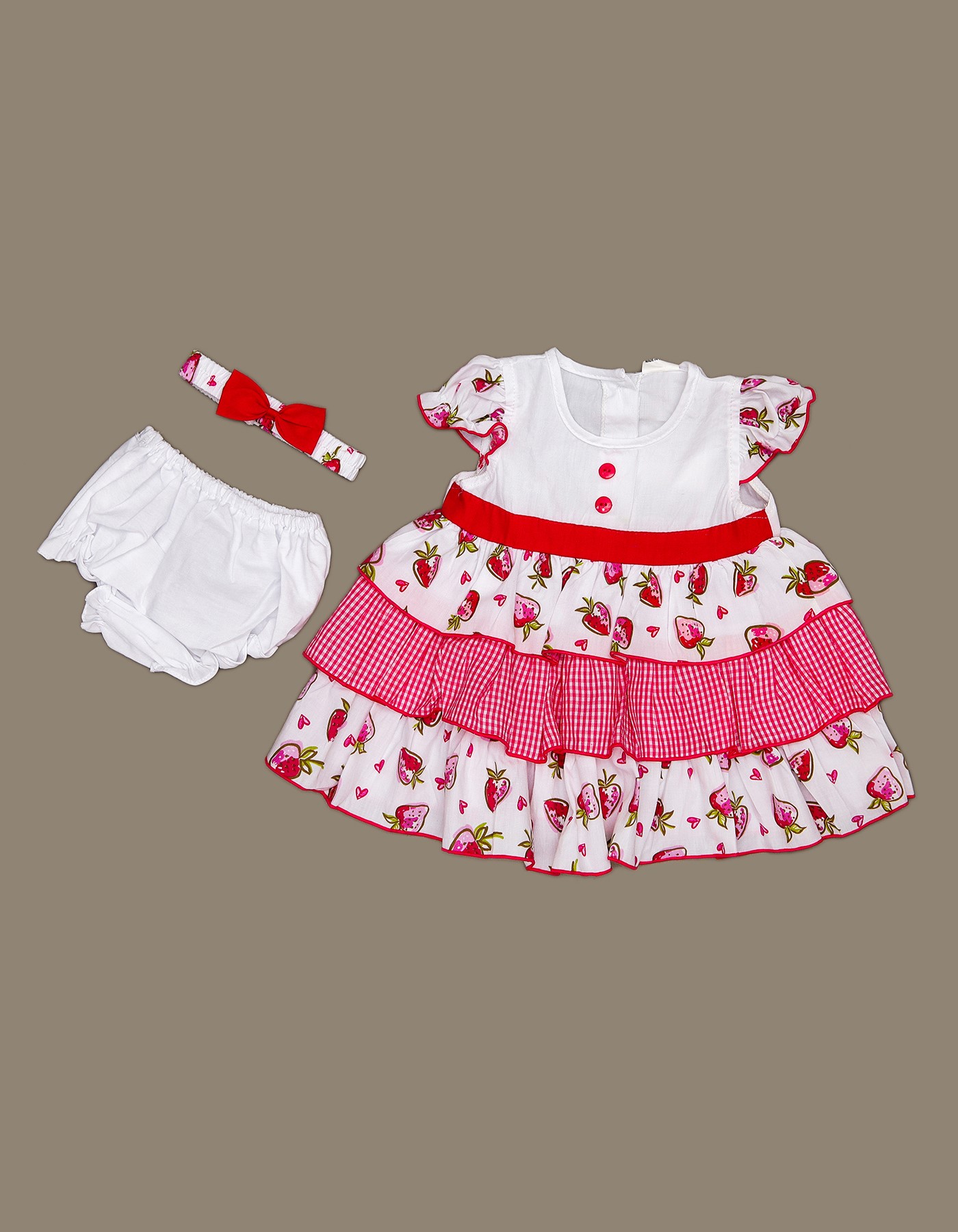 Let your little princess shine in this Strawberry Charm Baby Frock Set. This 3-piece outfit features a frilly white and red frock with cute strawberry prints, matching bloomers, and a stylish headband for that perfect coordinated look. Crafted from soft and breathable fabric, it keeps your baby comfortable while looking picture-perfect.