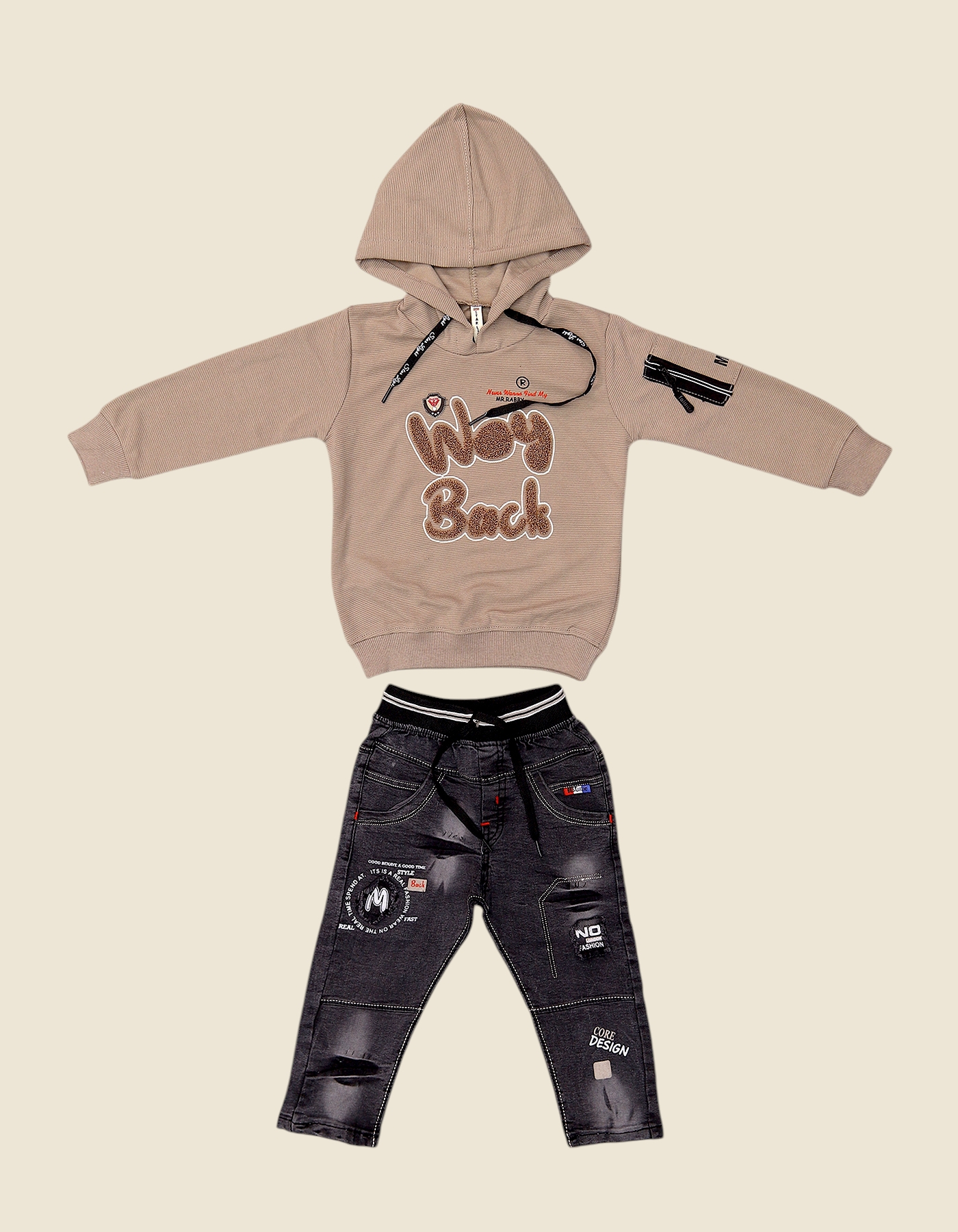 Three piece kids set with a hooded sweatshirt featuring a chenille chest patch and sleeve zipper pocket, paired with washed black printed joggers. Comfortable, durable and ready for play.
