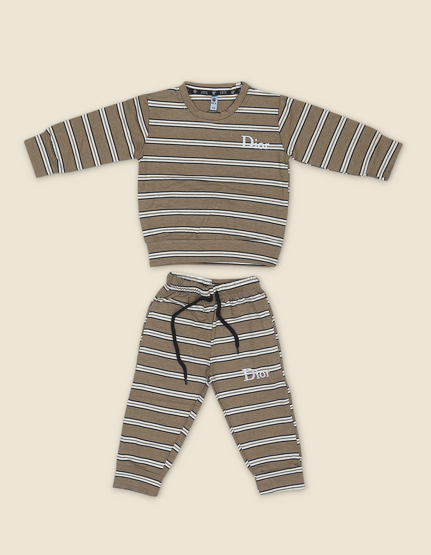 Designer inspired boys outfit with striped shirt and pants. Features bold branding and coordinated color scheme for a stylish casual look.