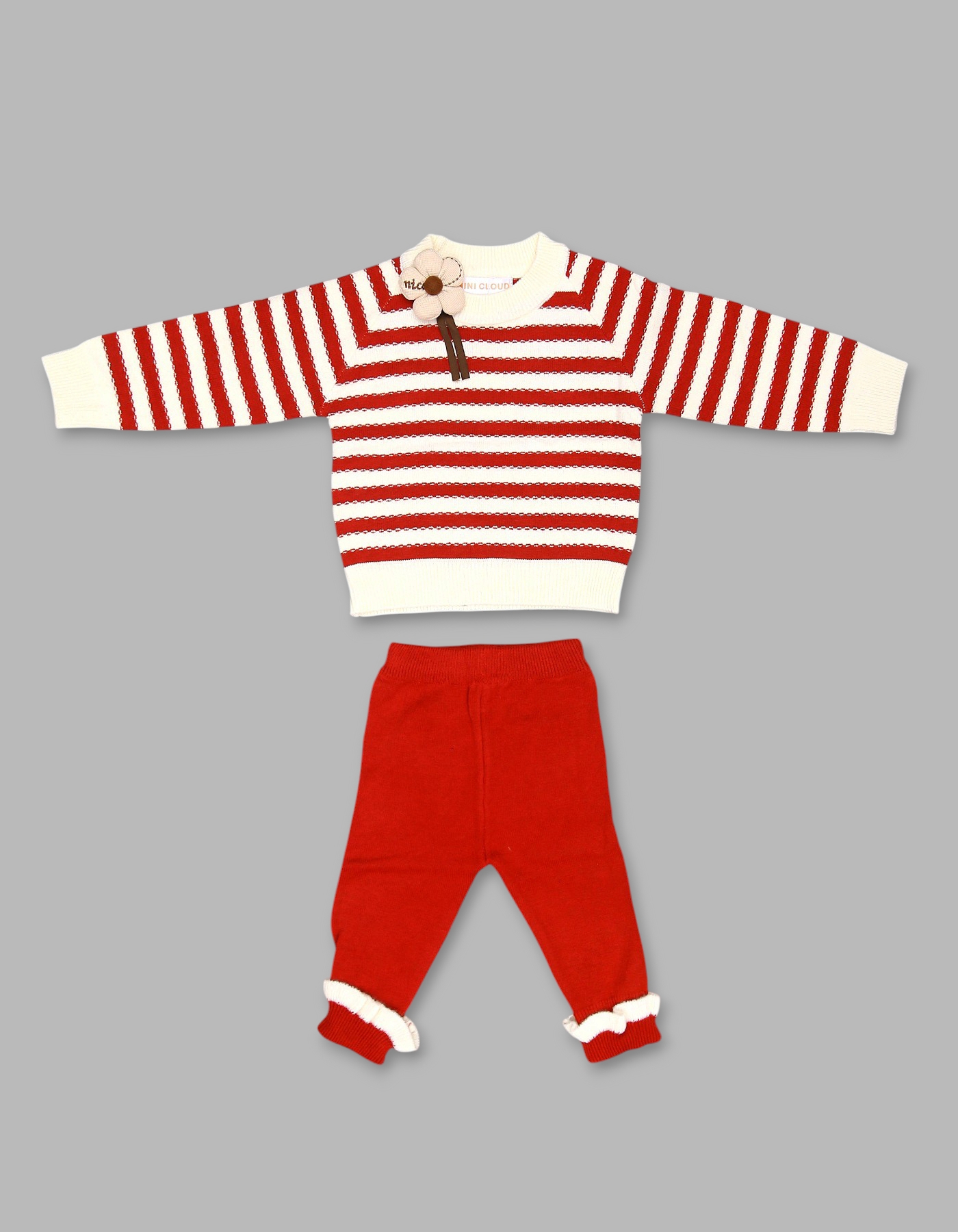 The Striped Flower Accent Red Woolen Suit is a warm and cheerful winter outfit that combines comfort with playful style. This 2-piece set features a striped sweater in red and off-white with a cute floral brooch detail, paired with solid red pants designed with contrasting white frilled cuffs for extra charm. Made from a premium wool blend, this set is soft, breathable, and gentle on delicate skin while providing reliable warmth for winter. The striped sweater design with ribbed edges adds a modern yet classic touch, and the elastic waist pants ensure comfort and flexibility throughout the day. Perfect for casual wear, festive occasions, or family gatherings, this woolen suit is both stylish and practical.
