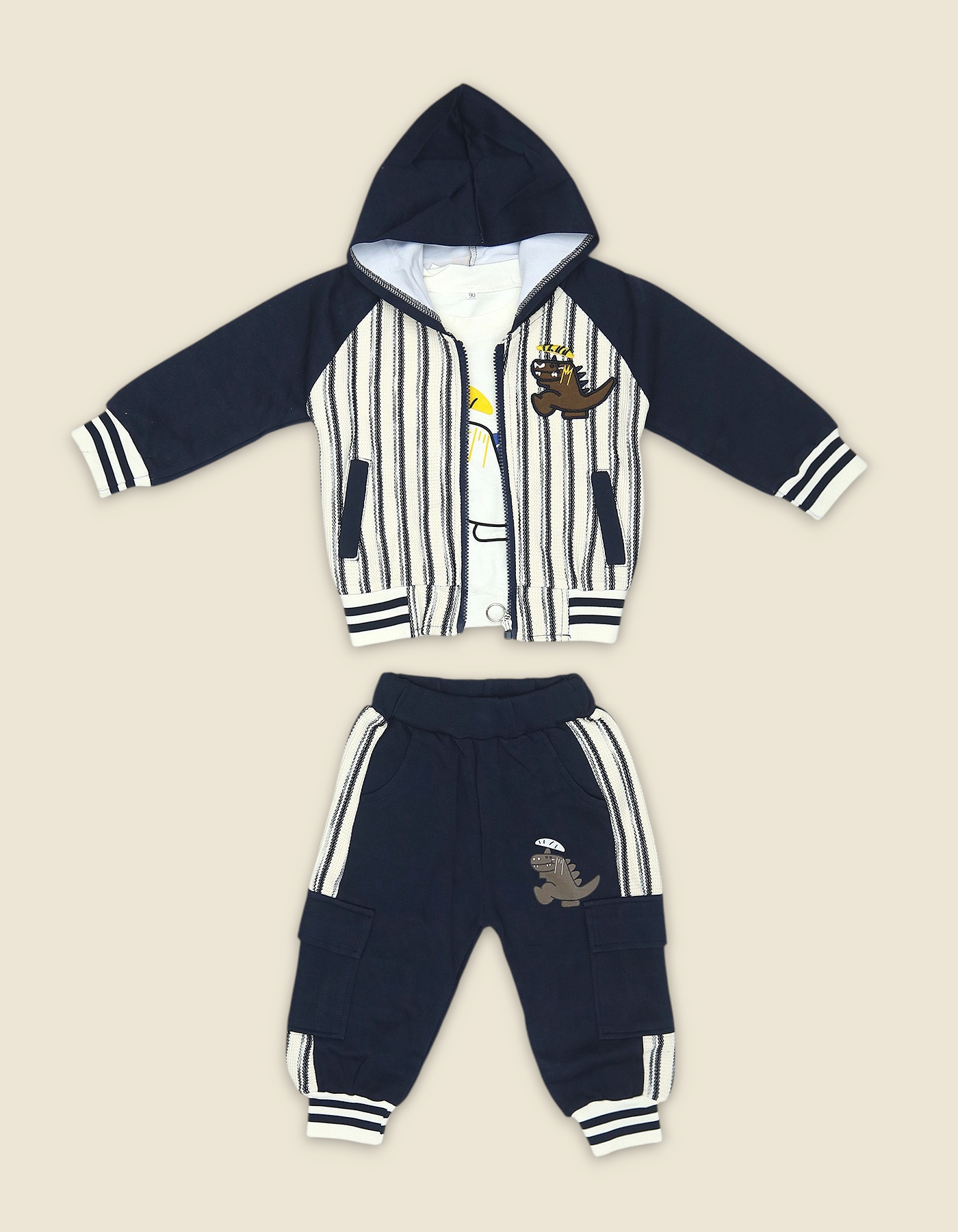 Three-piece kids outfit with a navy-and-cream striped hooded jacket, white graphic tee and navy cargo joggers. Sporty striped trims, patch dinosaur graphic and cargo pockets create a playful, comfortable set perfect for everyday wear.