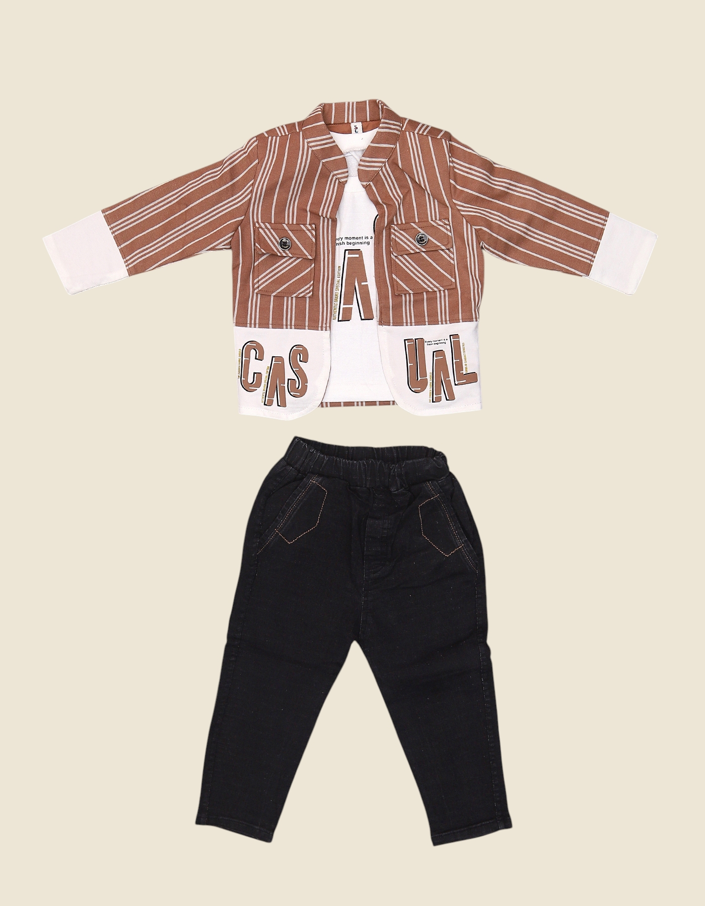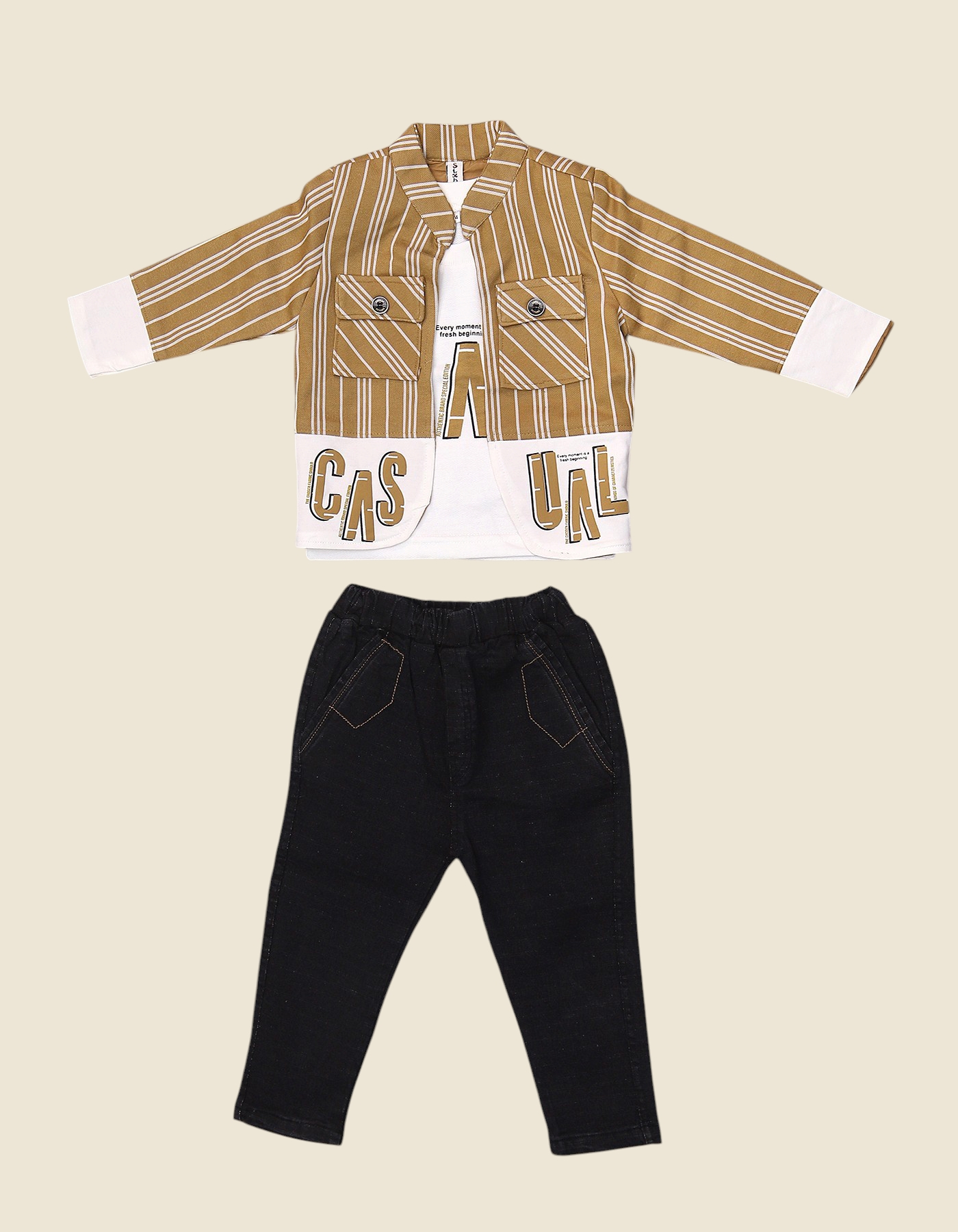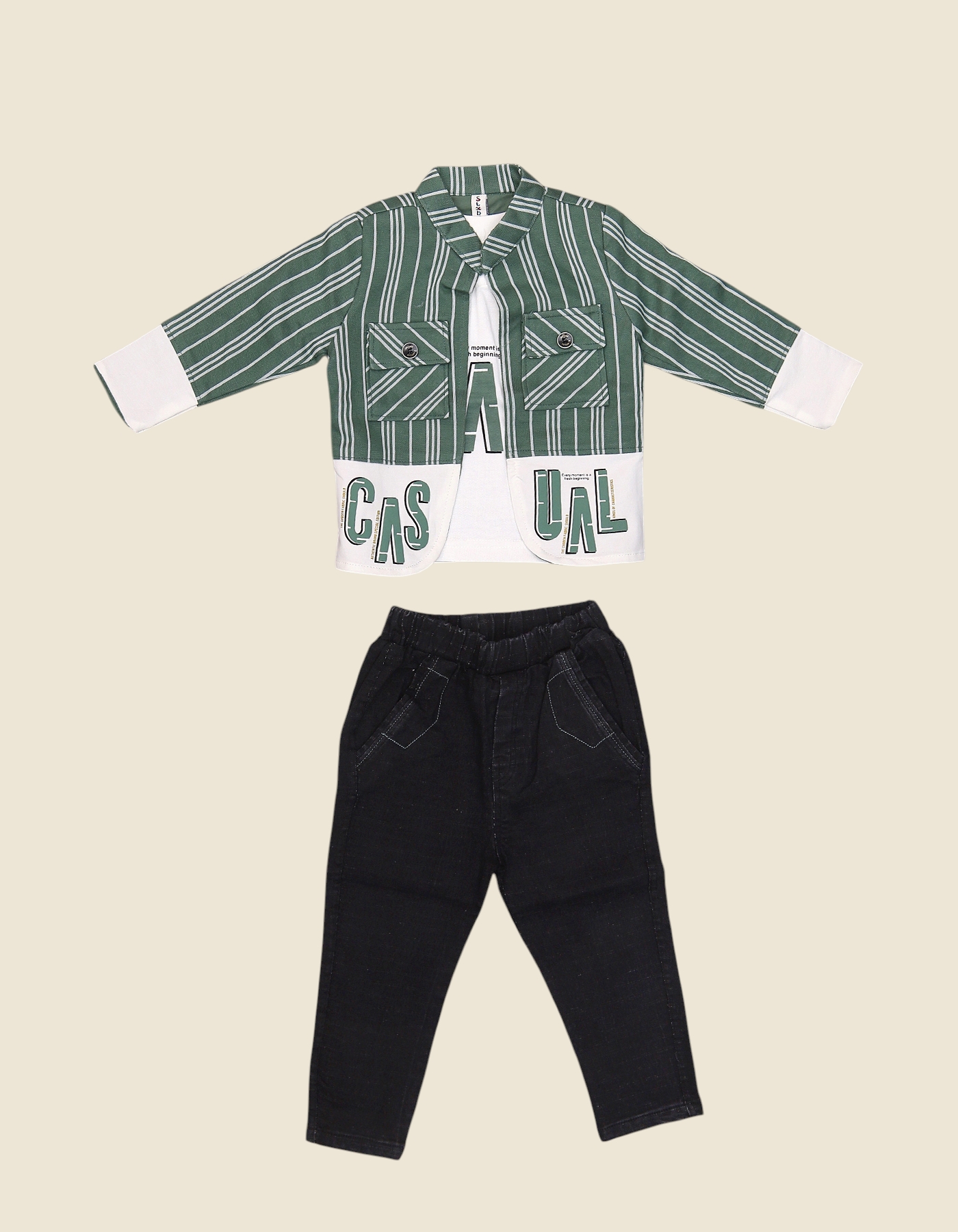 Two piece kids set with a striped jacket layered over a printed tee and paired with black elastic waist joggers. Slim fit jacket with pocket flaps and contrast hem print. Comfortable playwear with a modern casual look.