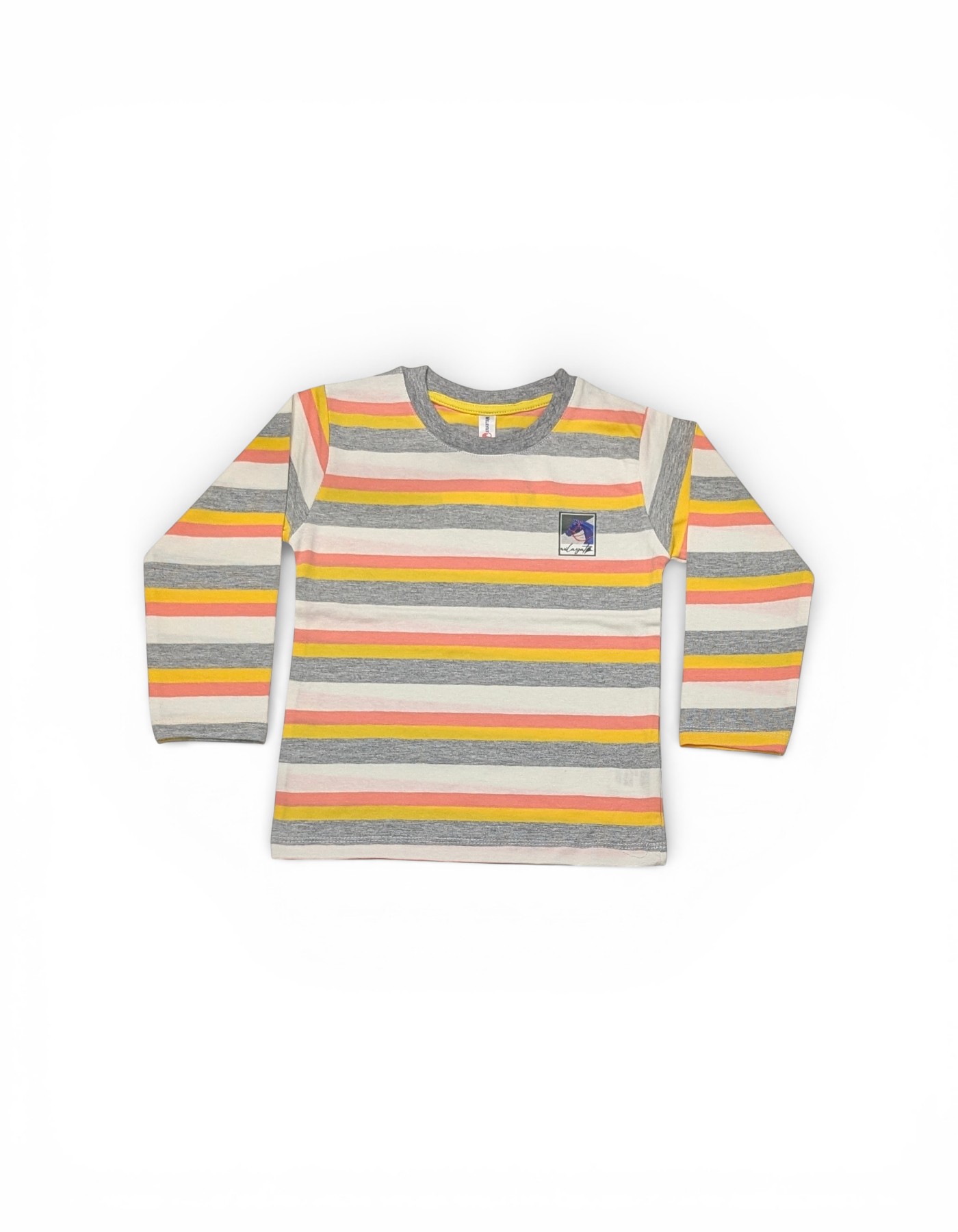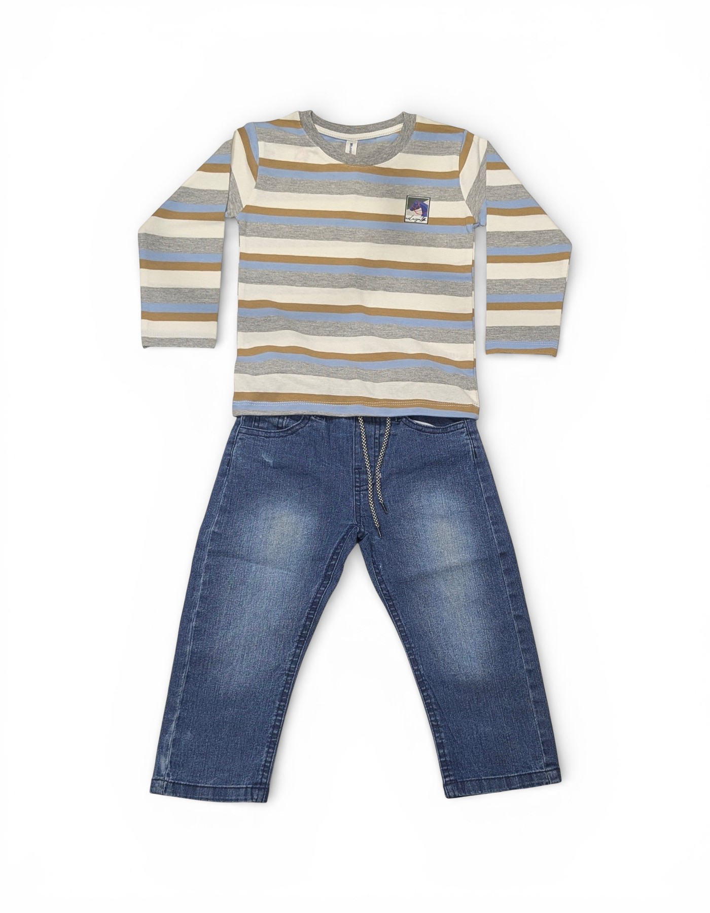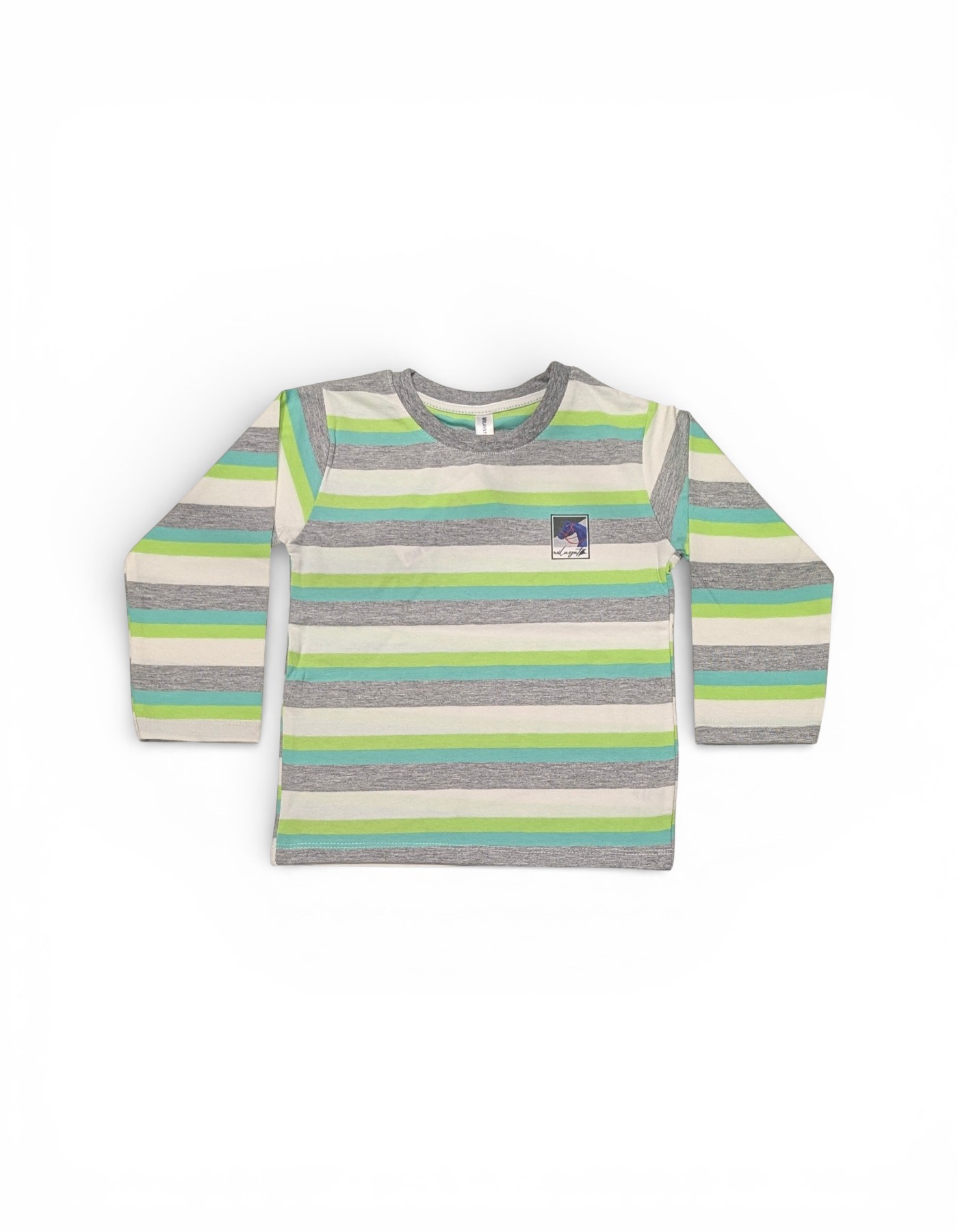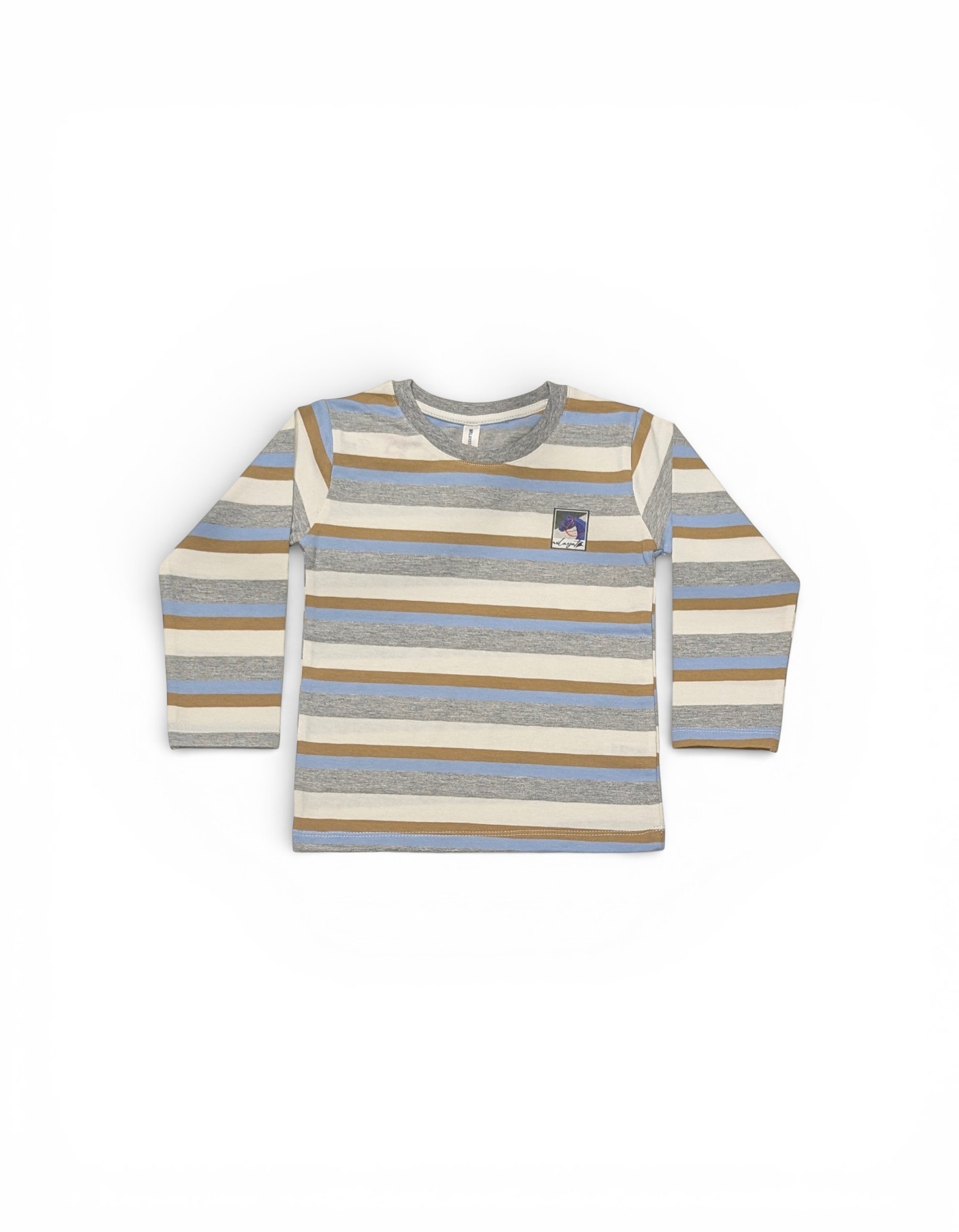 ong-sleeve shirt with blue, grey, and brown stripes.