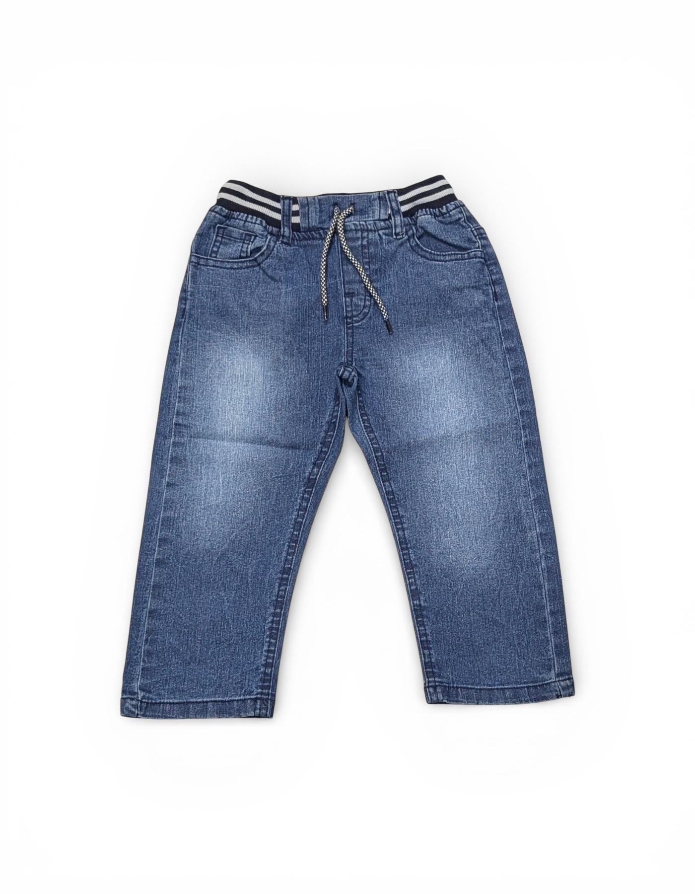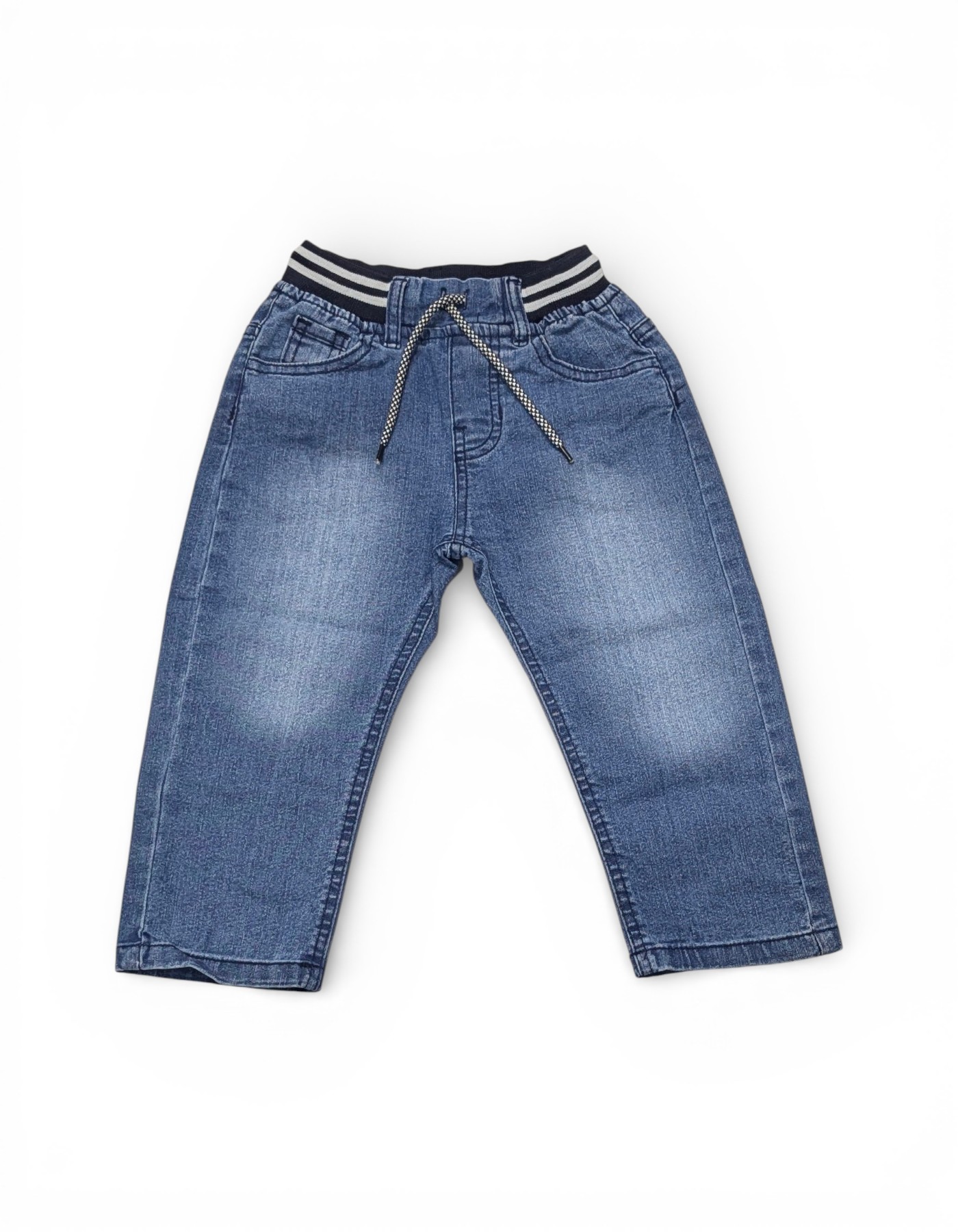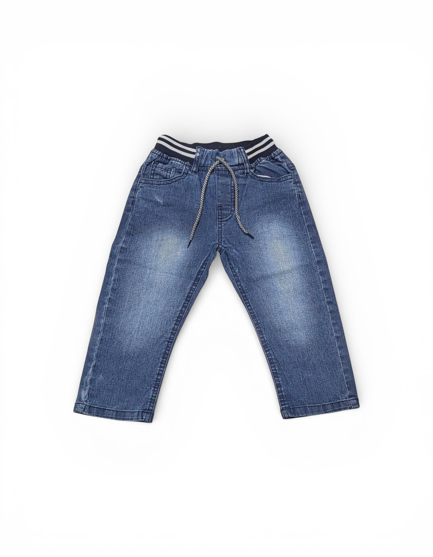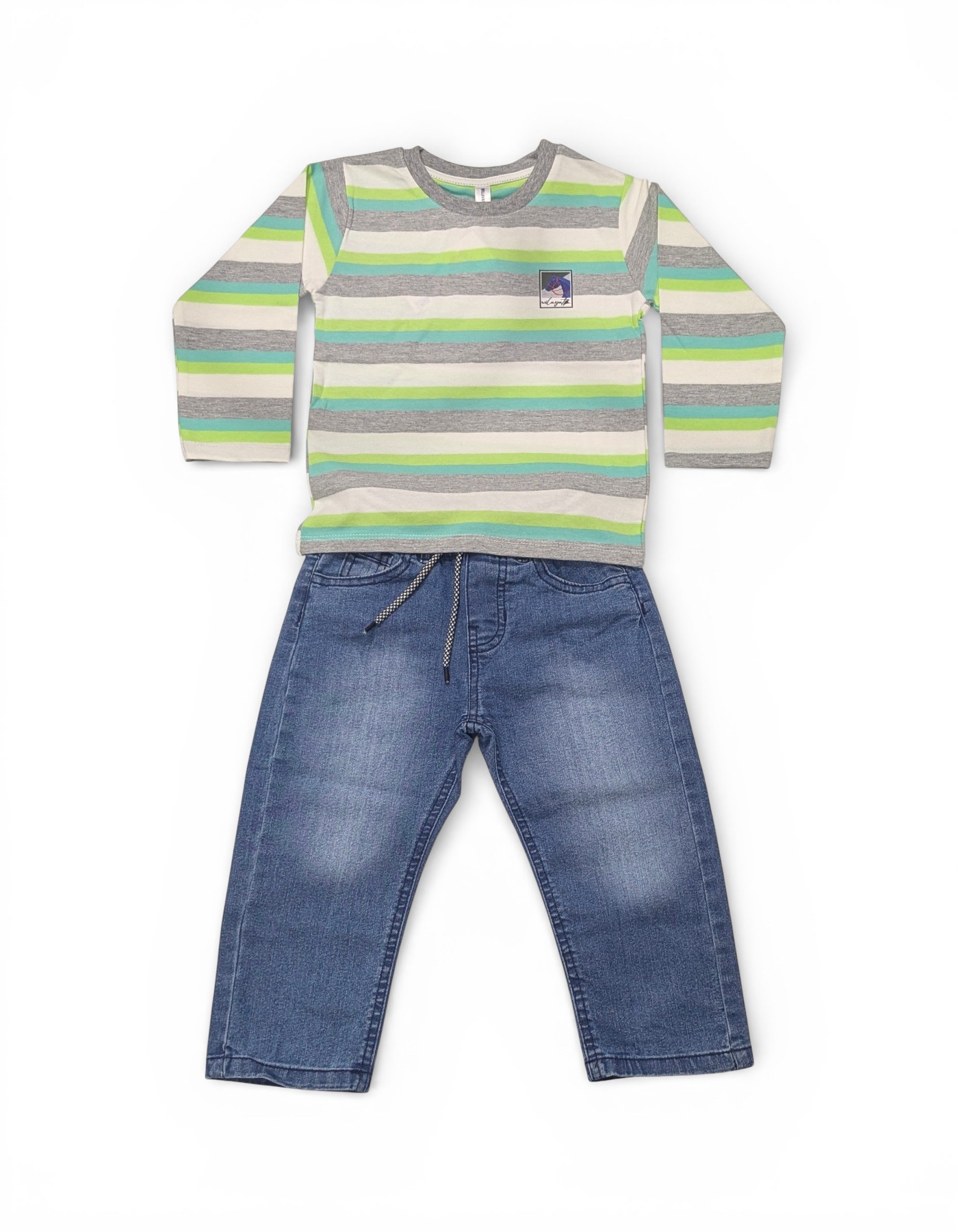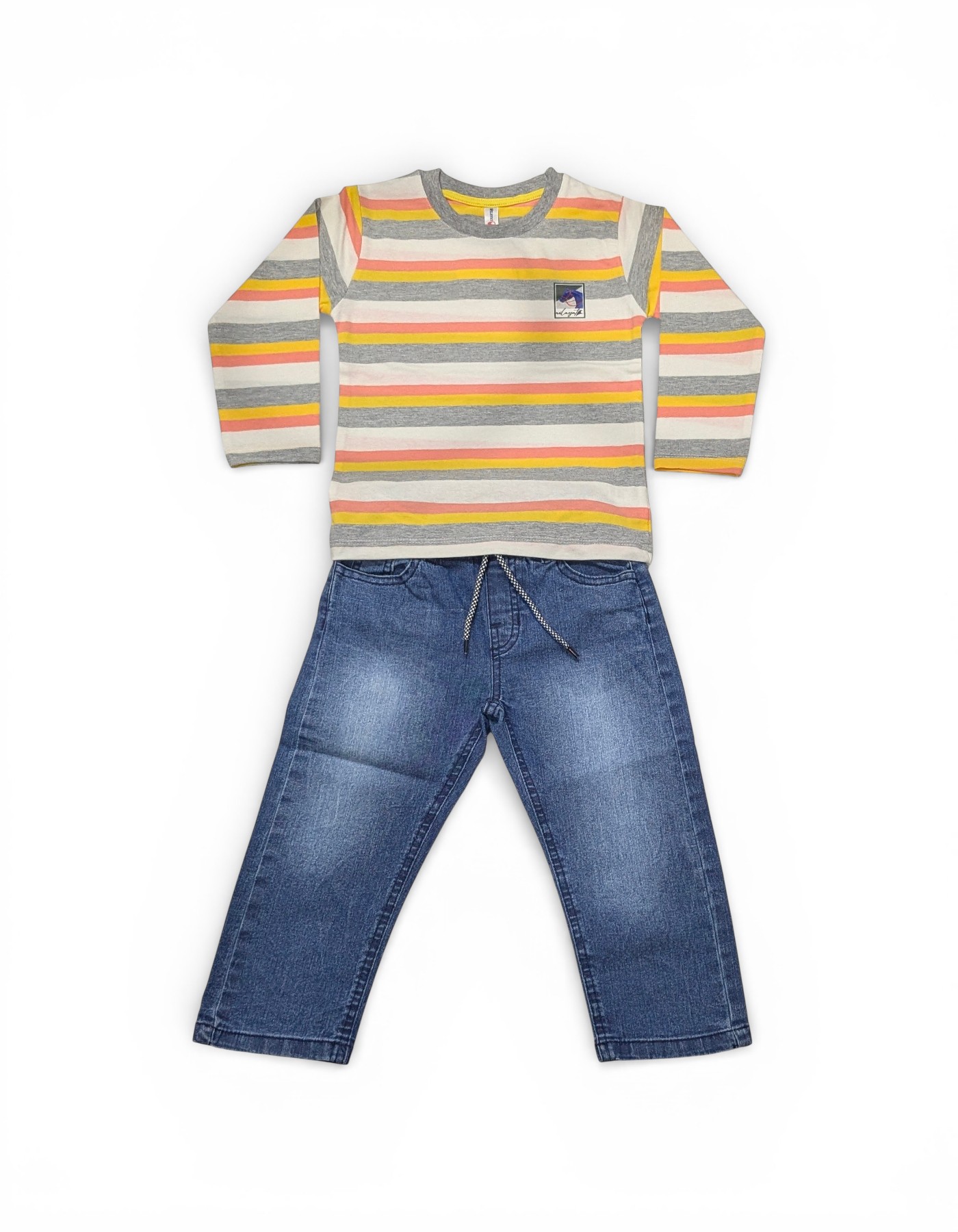 ong-sleeve shirt with blue, grey, and brown stripes.