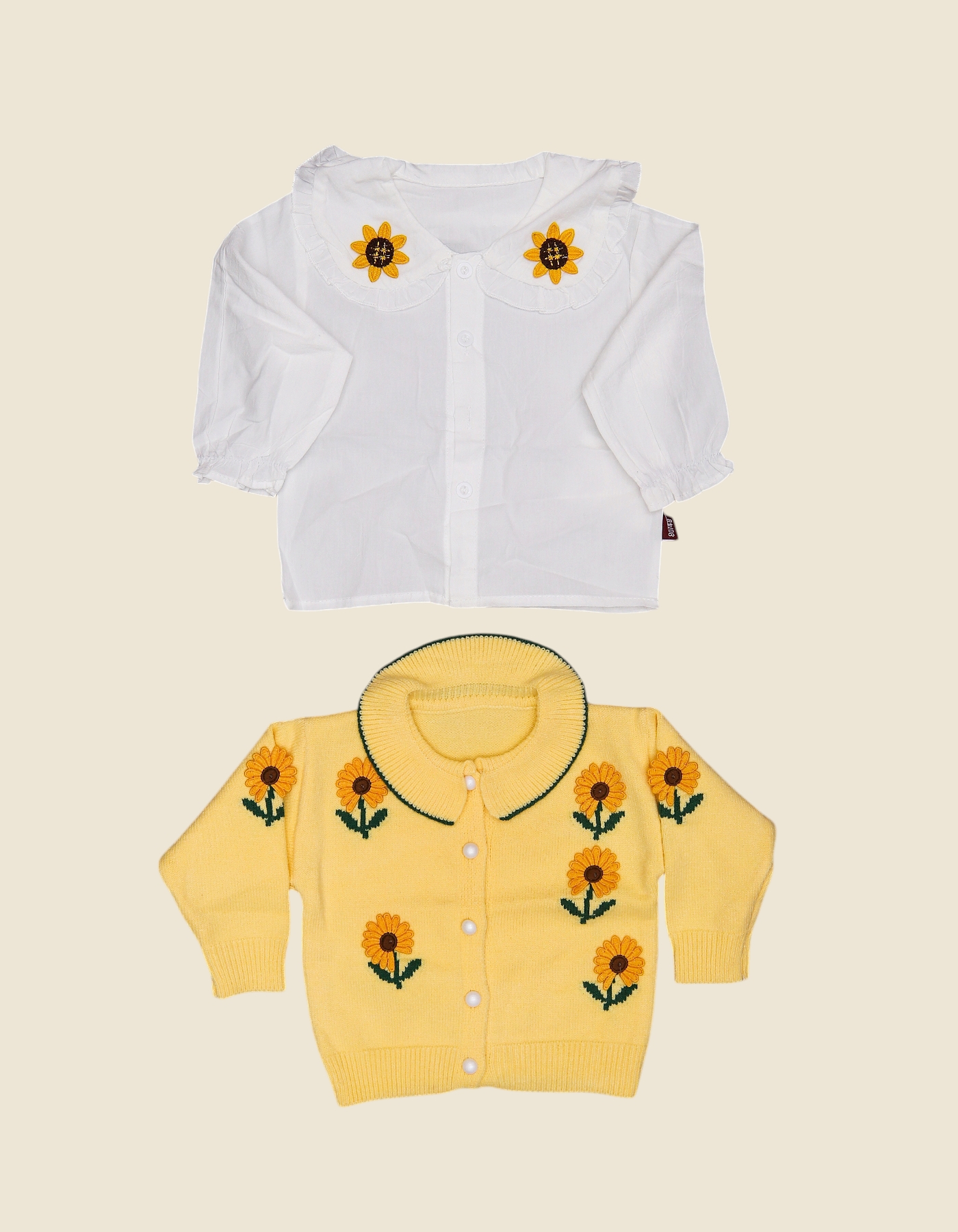 Sunflower Theme – Matching floral embroidery on shirt collar and cardigan for a coordinated look.