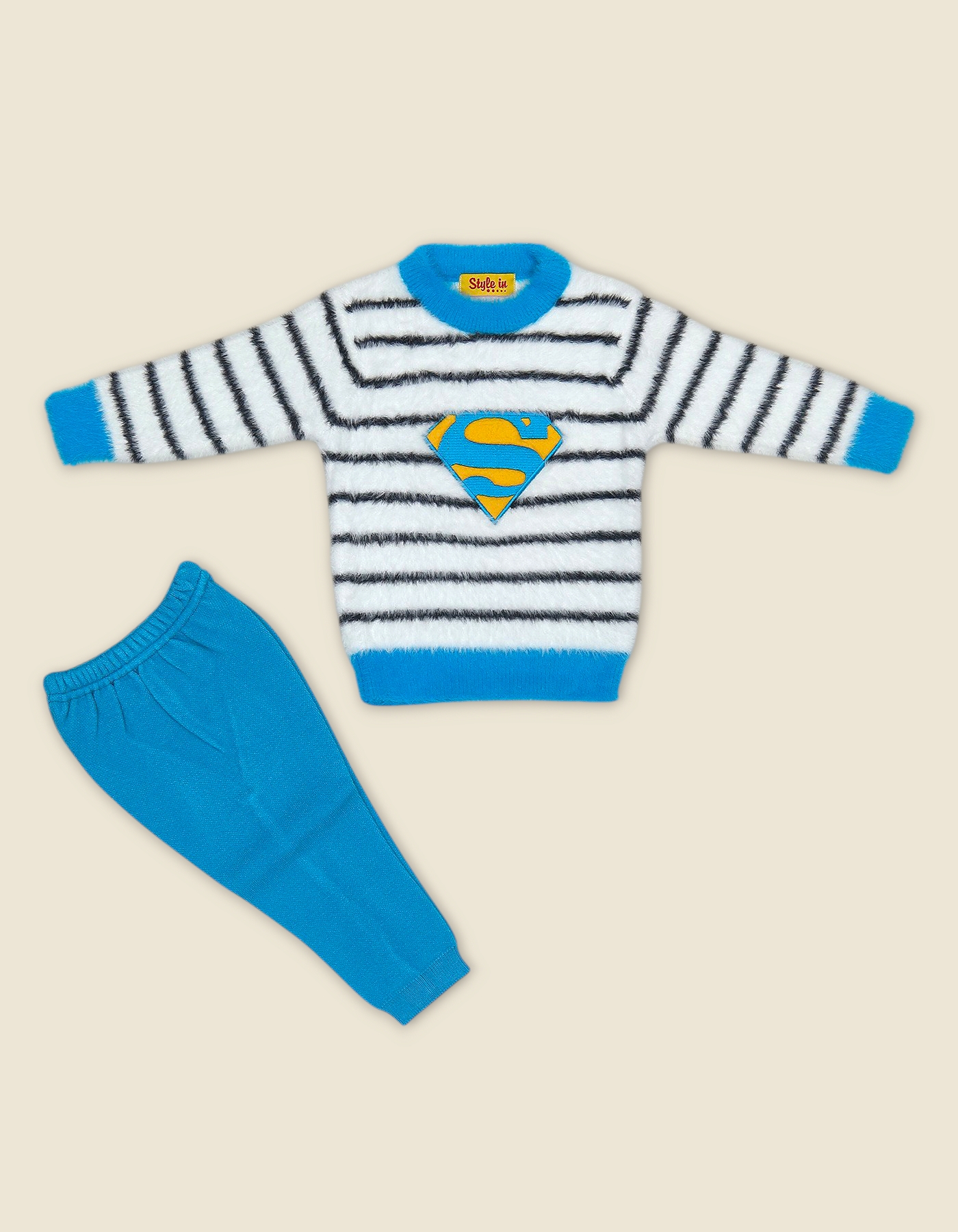 Bold woolen outfit for boys with Superman logo sweater and matching pants. Designed for warmth, comfort and superhero style.