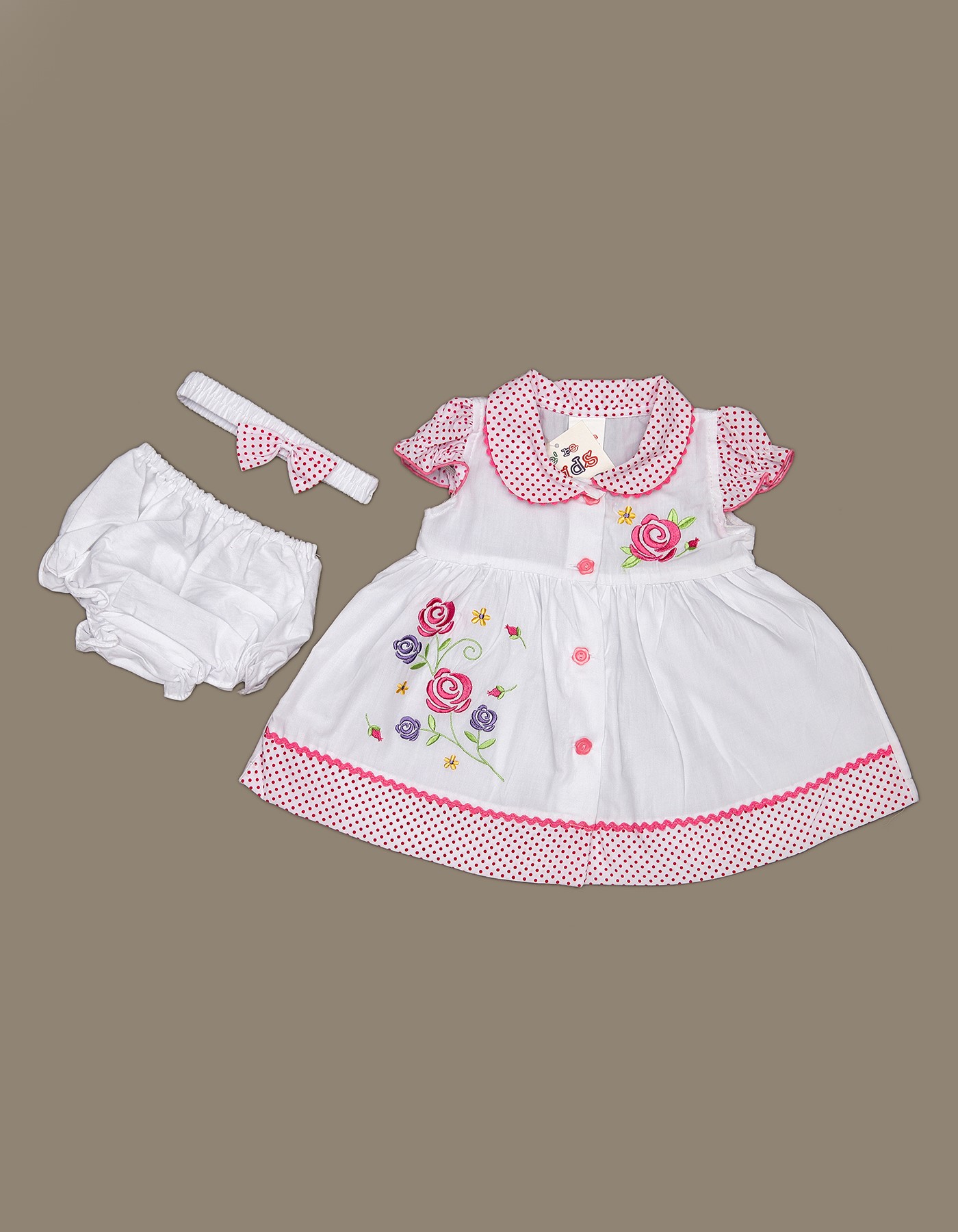 Dress your little angel in the adorable Sweet Blossom Baby Frock Set, featuring delicate floral embroidery and pretty polka-dot detailing. This charming 3-piece outfit includes a frock, soft bloomers, and a matching bow headband for a complete look. Perfect for special occasions or casual outings, the lightweight and breathable fabric ensures your baby stays stylish and comfortable all day long.