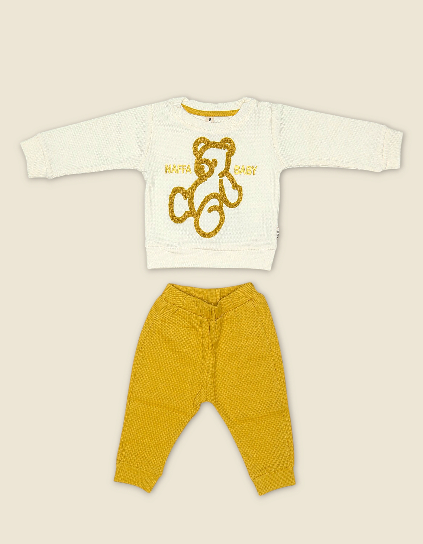Soft and stylish baby outfit with teddy bear graphic and printed text. Includes long sleeve shirt and matching pants in bold colors.