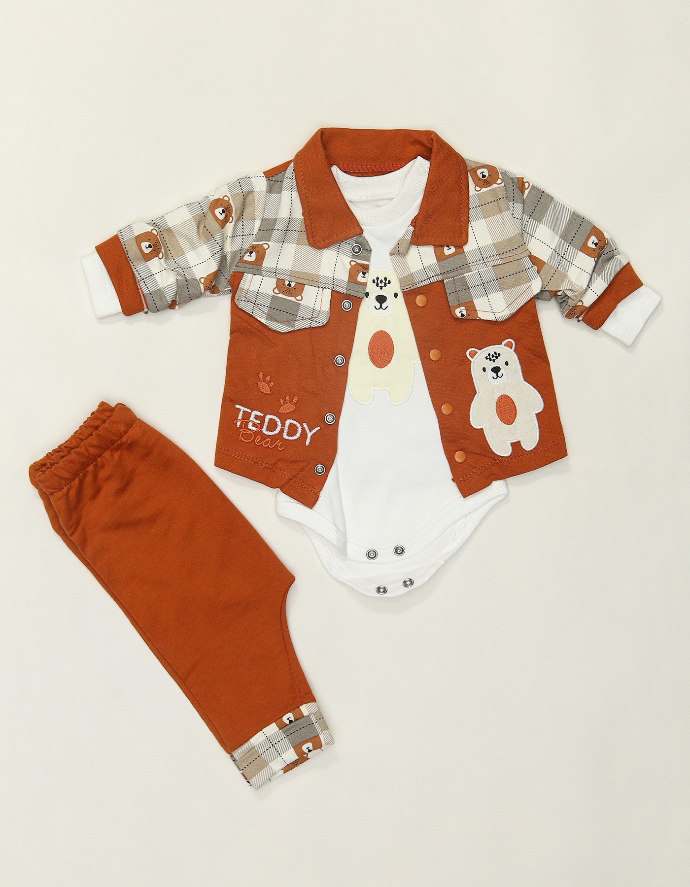 Dress your little one in this Teddy Bear Baby Outfit — a cozy and stylish 3-piece set perfect for everyday wear or special outings. This adorable set includes a soft white cotton bodysuit, a trendy checkered brown shirt-jacket with cute teddy bear patches, and matching brown pants with cuff details. Designed for comfort and cuteness in every stitch.