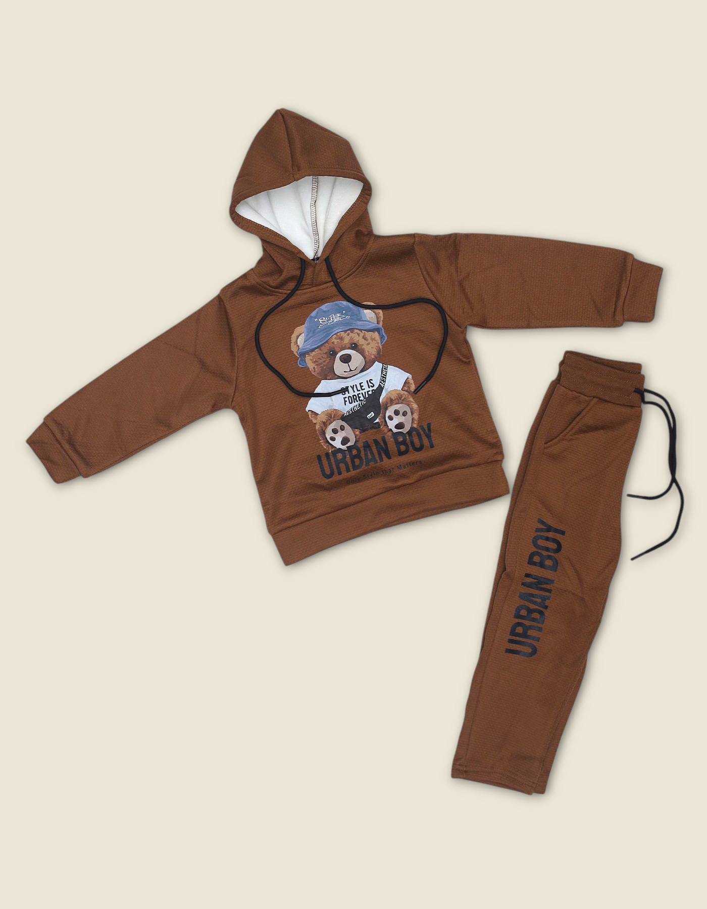 This is a trendy and warm two-piece track suit set featuring a rich brown hooded sweatshirt and matching joggers. The sweatshirt has a cute graphic print of a teddy bear wearing a cap and a text slogan beneath it reading 'URBAN BOY'. The joggers feature the same 'URBAN BOY' text printed vertically down the leg. Made from a soft, cozy material, this set is perfect for casual outings, playful days, and keeping your child comfortable and stylish in cool weather.