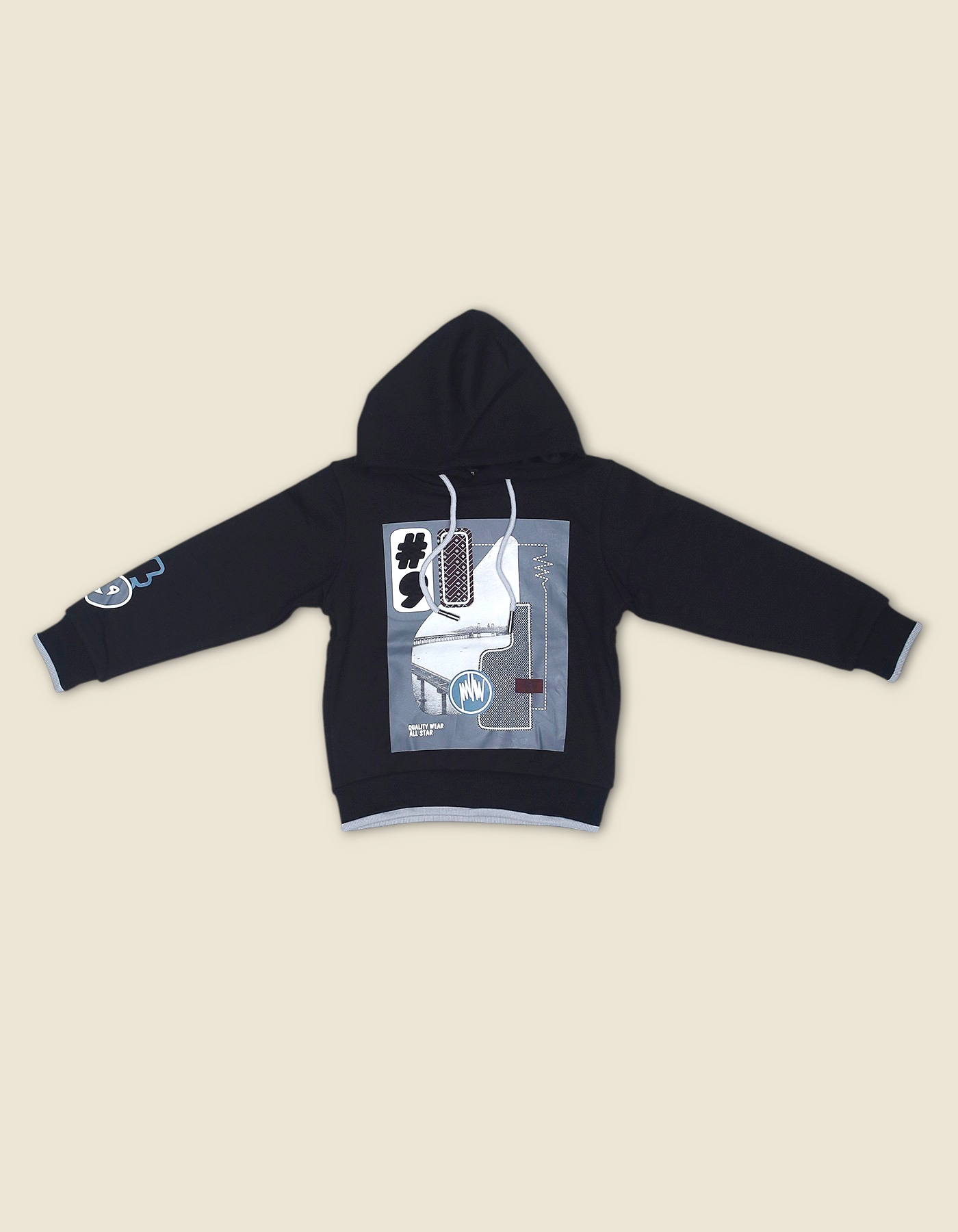 This is a sporty and cozy two-piece track suit set featuring a dark grey hooded sweatshirt and matching track pants. The sweatshirt has a mottled or textured print and a large white athletic-style logo graphic on the chest. It includes a kangaroo pocket for functionality. The track pants have a drawstring waist and a coordinating logo print down the leg. Made from a warm fleece blend, this set is perfect for casual outdoor activities, play, and keeping warm in cool weather.