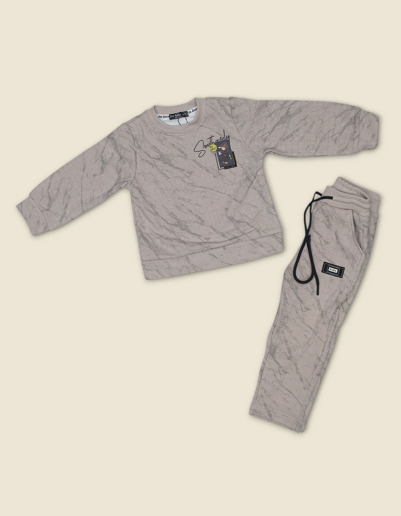 This is a stylish and comfortable two-piece track suit featuring a beige sweatshirt and matching joggers, both with a unique marble-like textured fabric. The sweatshirt has a small graphic print on the chest featuring a yellow smiley face and stylized black text. The joggers include decorative black lacing and a small brand patch near the pocket. Made from a soft and light material, this set is ideal for casual outings and relaxed play while offering a unique fashionable look.