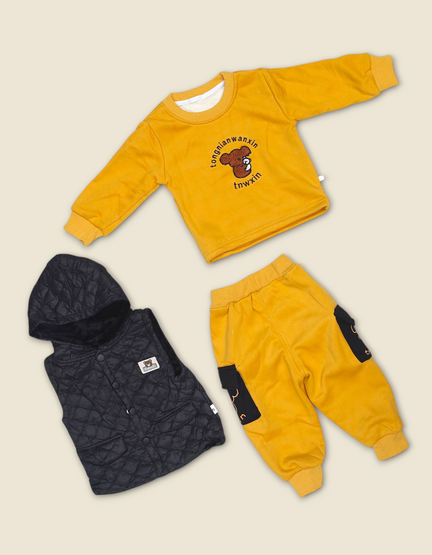 This is a complete and cozy three-piece layered set perfect for cold weather. It includes a bright yellow long sleeve sweatshirt with a subtle teddy bear graphic, a black quilted vest with a hood for extra warmth, and matching yellow joggers. The joggers feature black contrast patches on the side pockets for a stylish touch. Made from soft, comfortable material, this set offers excellent warmth, versatility, and a fun look for casual outings and daily wear.