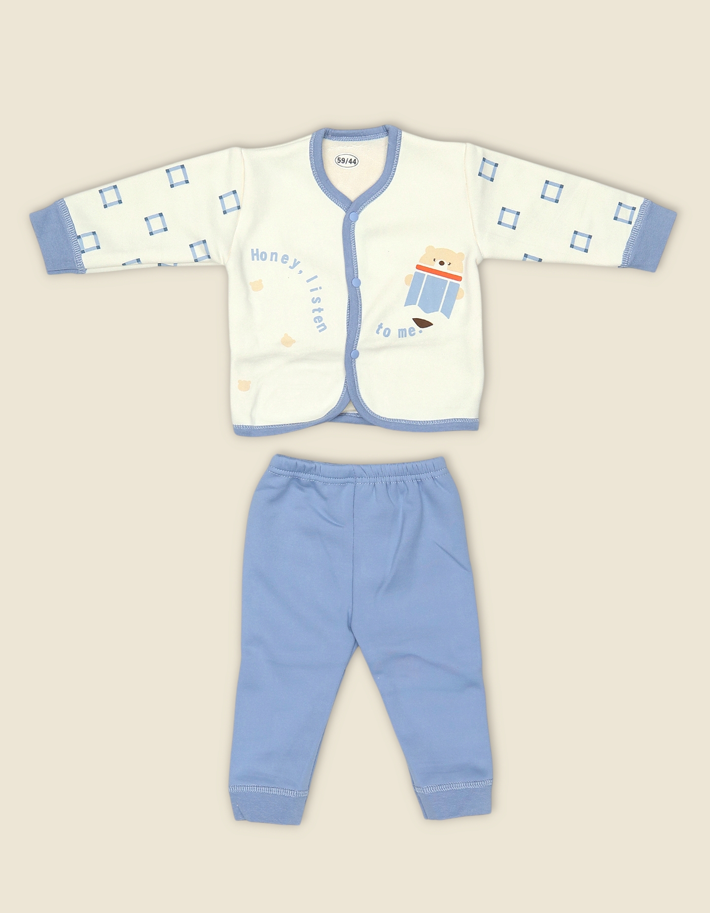Soft two-piece baby outfit featuring a white top with blue trim, bear print, and matching light blue pants. Designed for comfort and everyday wear.