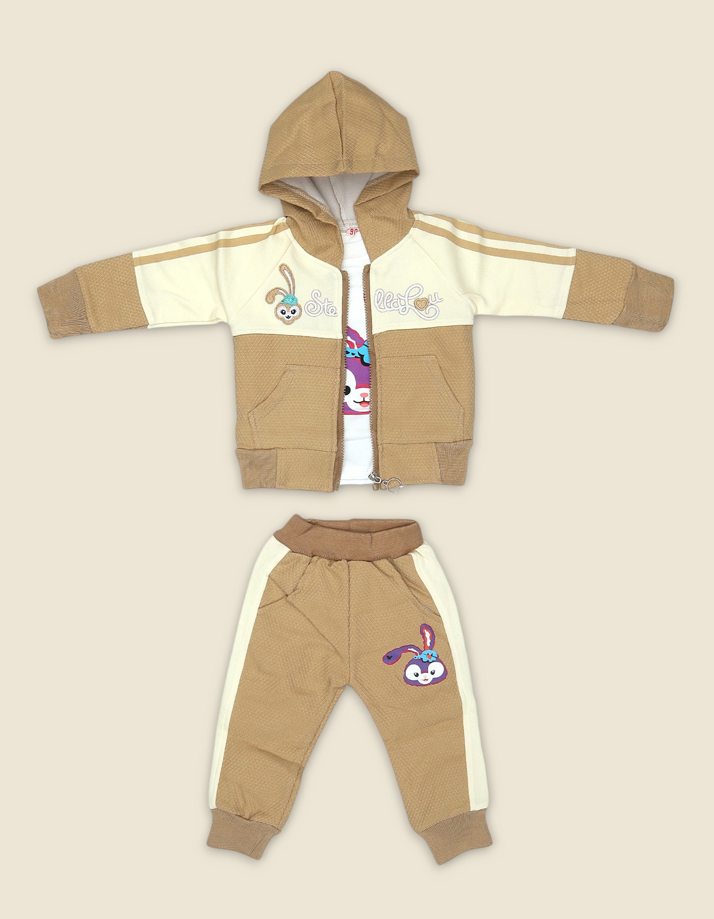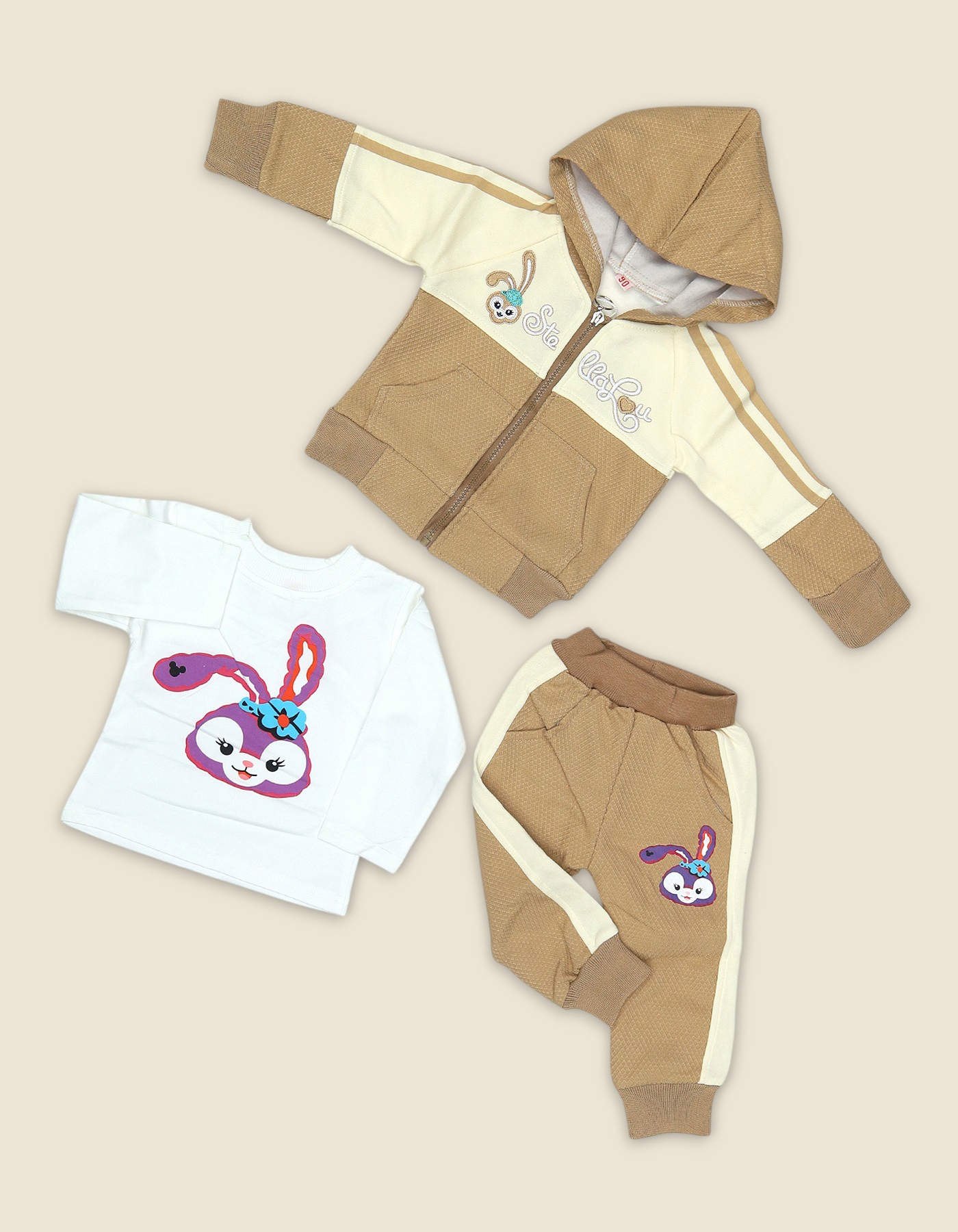 Cute three piece outfit set for toddlers including hooded jacket, matching pants and t shirt. Designed in soft beige and cream tones with playful bunny graphics, perfect for daily wear and comfort.
