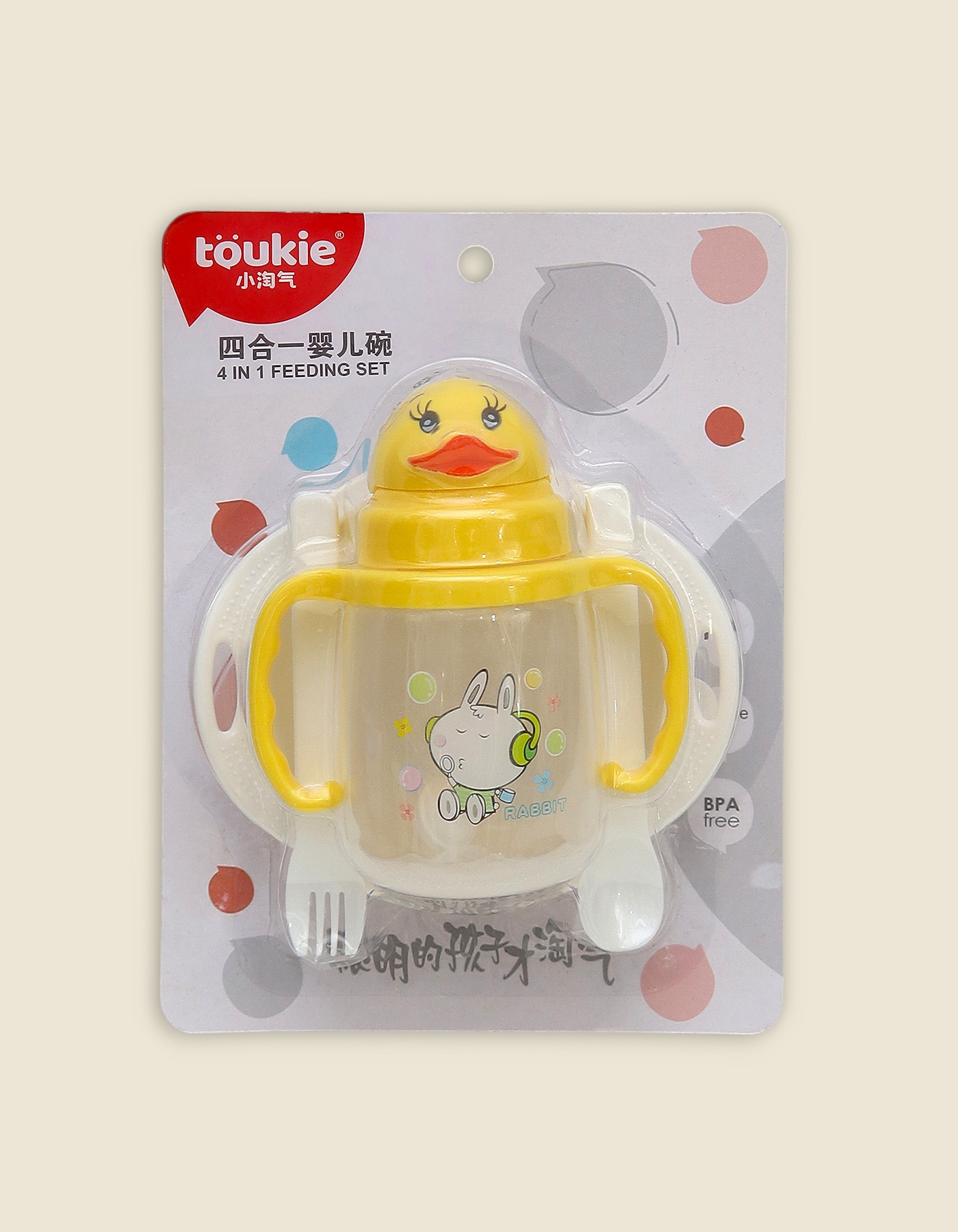 The Toukie 4-in-1 Baby Feeding Set is an all-in-one mealtime starter kit designed to help infants transition from bottle-feeding to independent eating. Featuring a cheerful yellow duck theme, this set is crafted from high-quality, food-grade materials to ensure safety and durability for daily use.