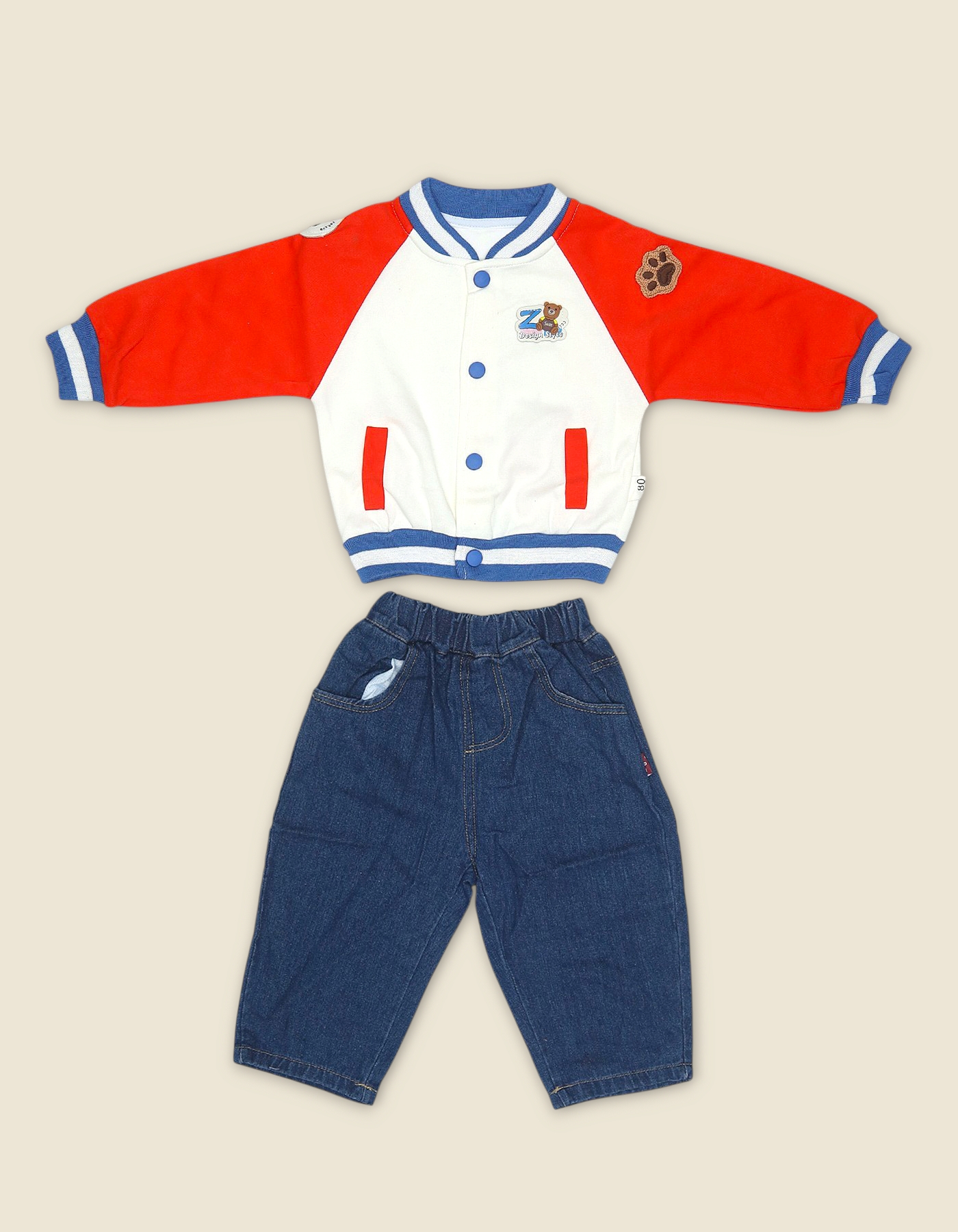 Stylish boys outfit with varsity jacket and denim pants. Features embroidered patches and striped details for a sporty casual look.