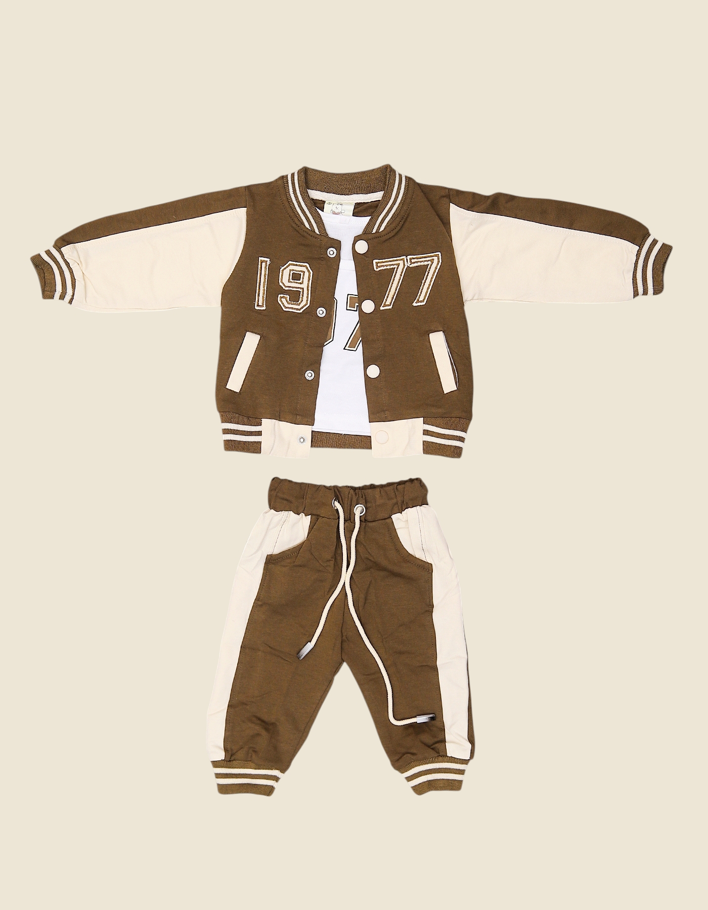 Sporty boys outfit with varsity jacket, t shirt and jogger pants. Features retro number print and striped details for a stylish casual look.