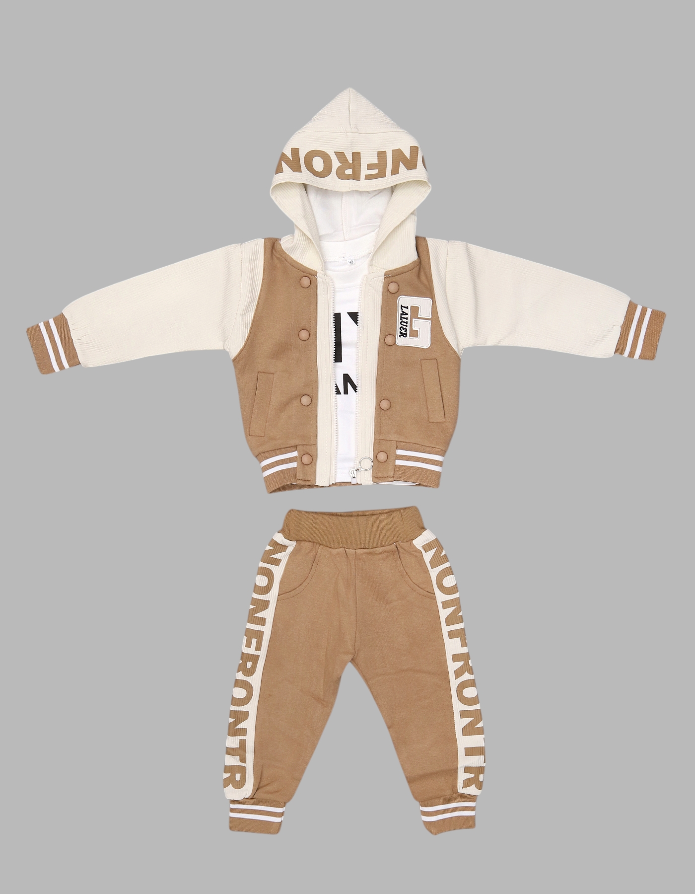 Upgrade your boys wardrobe with this trendy varsity-inspired 3-piece set. Featuring a brown and white hooded jacket with bold lettering, a matching inner T-shirt, and jogger pants with sporty side stripes, this outfit offers both comfort and street-style vibes. Perfect for school, playdates, or casual outings, it’s a must-have for fashion-forward kids.