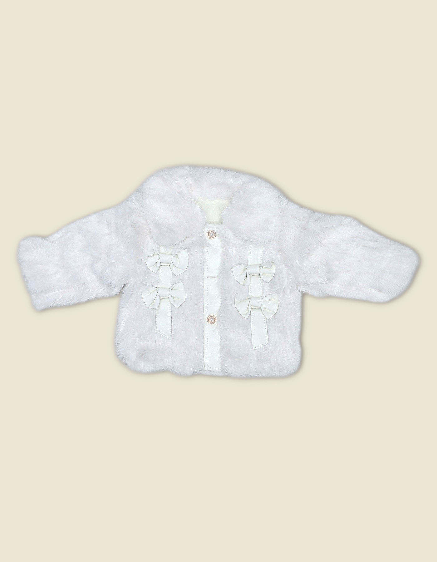An elegant white faux fur jacket for babies featuring six satin bows and a soft button-down front. Designed for warmth and charm, perfect for winter wear or special occasions.