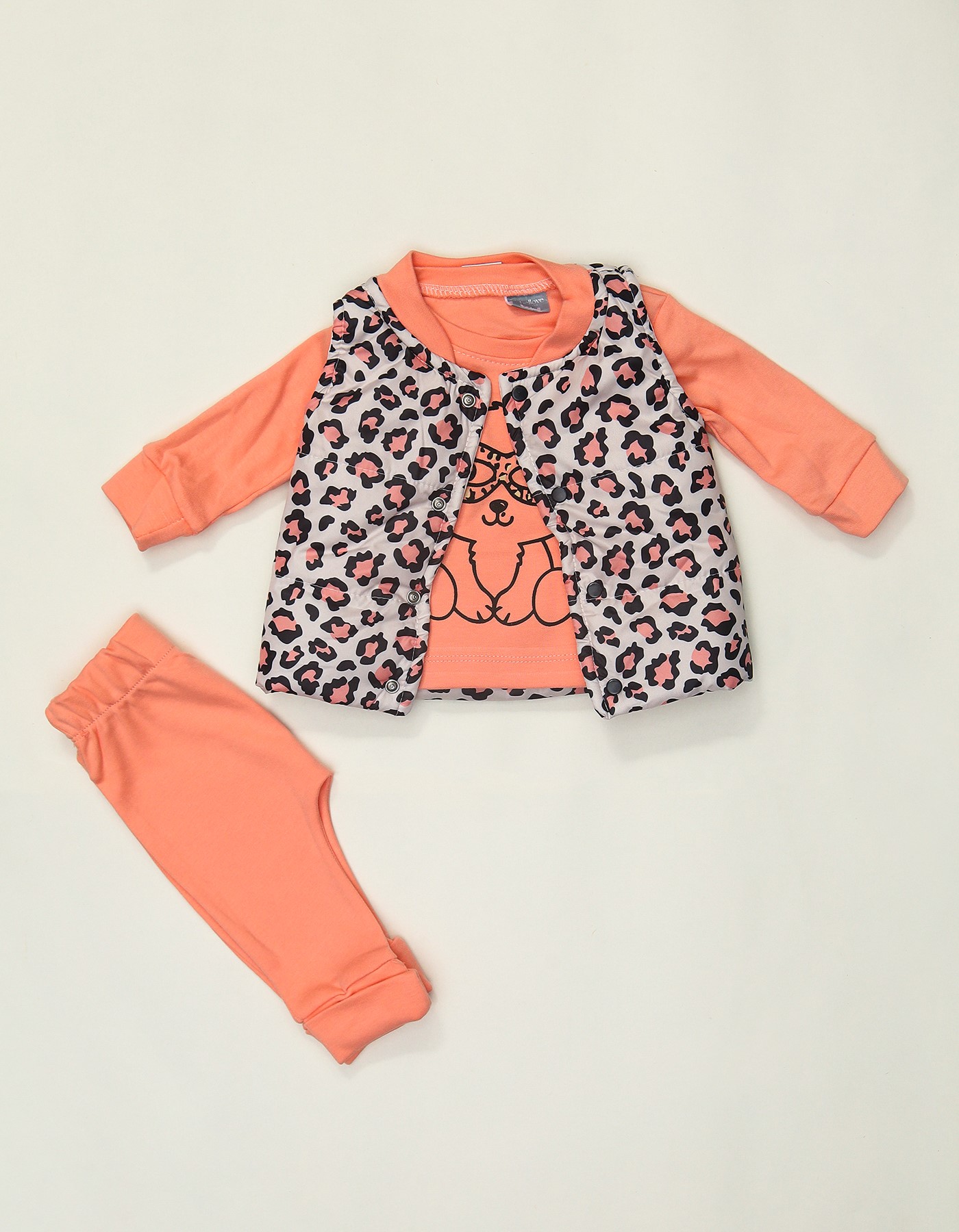 Dress your little one in this Wild Charm 3-Piece Baby Girl Outfit that blends style and comfort. The set includes a peach long-sleeve top with a cute animal print, a trendy leopard-print vest, and soft matching pants. Perfect for casual outings, playdates, or cozy indoor wear, this outfit adds a fashionable twist to your baby girl's wardrobe.
