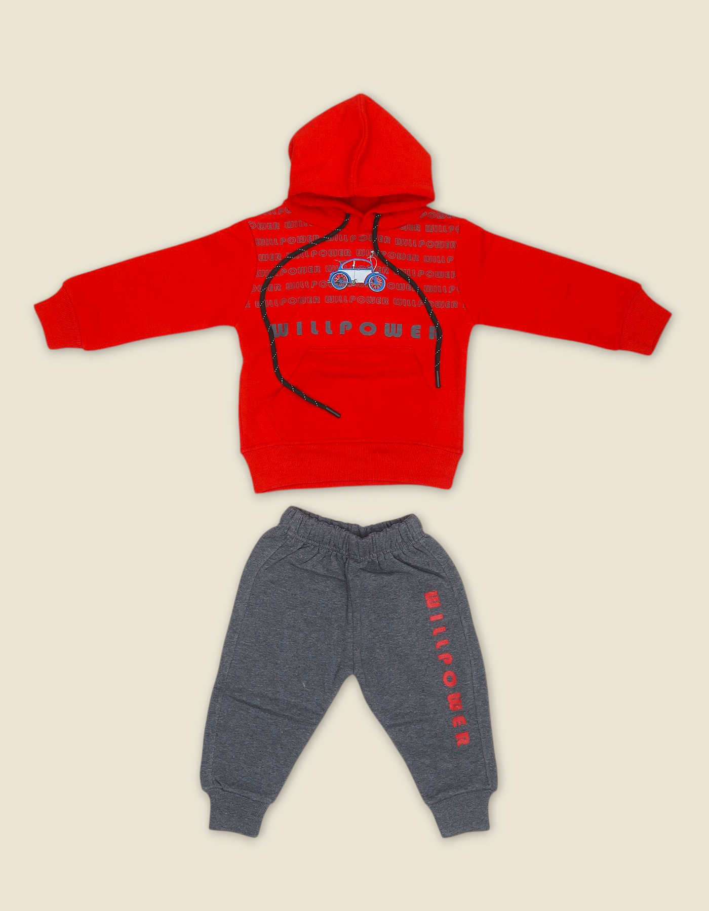 Motivational boys outfit with hooded sweatshirt and jogger pants. Features bold willpower text and graphic design for a sporty casual look.