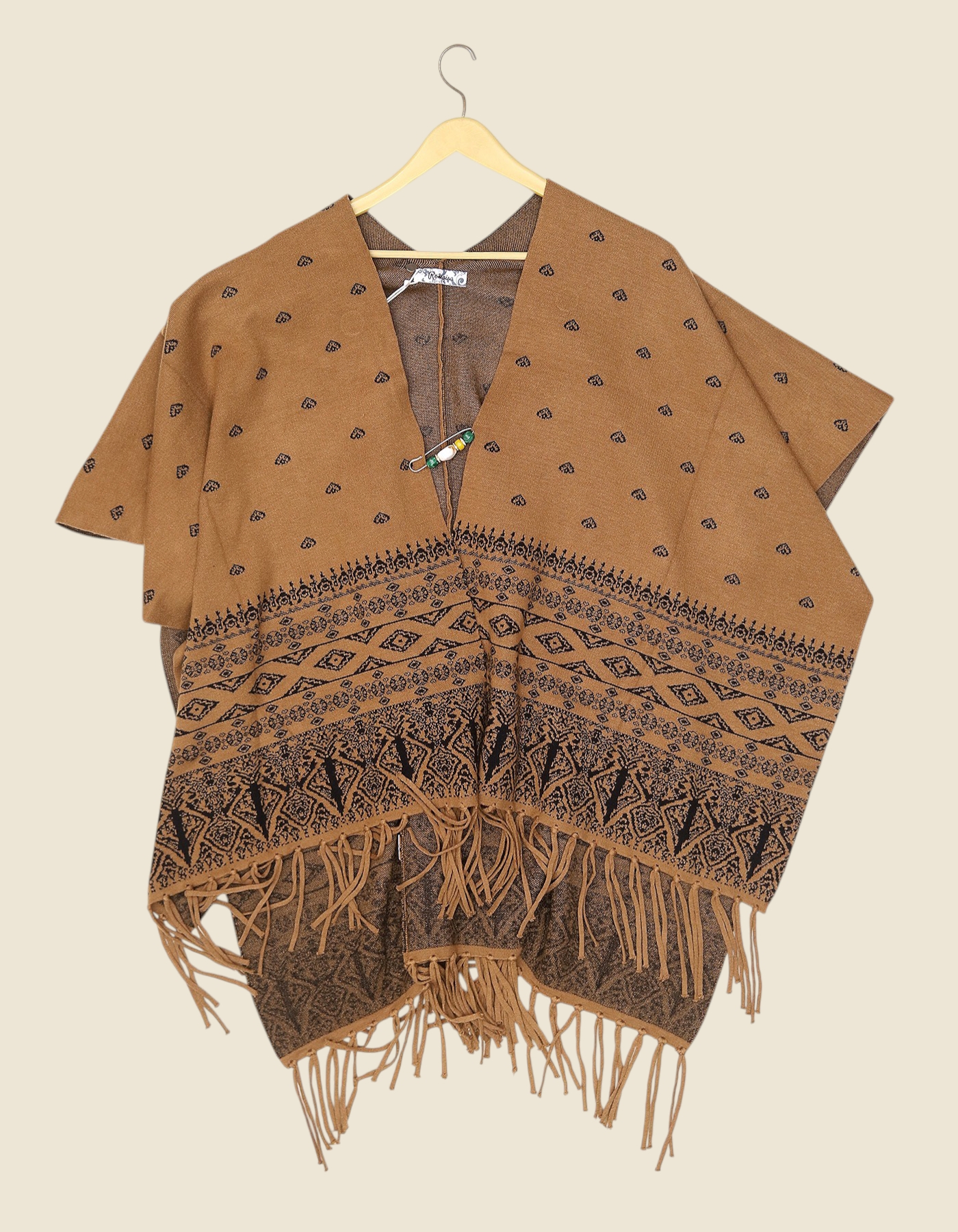 Wrap yourself in timeless elegance with this beautifully designed woolen poncho shawl. Featuring intricate ethnic-inspired patterns, a soft woven texture, and delicate tassel fringes, this versatile piece is perfect for keeping warm while adding a stylish touch to your outfit. Its open-front design with a decorative clasp makes it easy to wear for both casual and festive occasions.